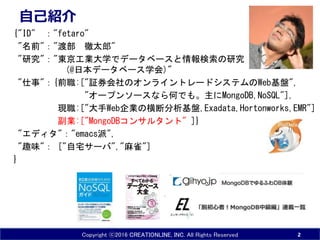 INC. All Rights Reserved 自己紹介 2 {"ID" :"fetaro" "名前":"渡部 徹太郎" "研究":"東京工業大学でデータベースと情報検索の研究 (@日本データベース学会)" "仕事":{前職:["証券会社のオンライントレードシステムのWeb基盤", "オープンソースなら何でも。主にMongoDB,NoSQL"], 現職:["大手Web企業の横断分析基盤,Exadata,Hortonworks,EMR"] 副業:["MongoDBコンサルタント" ]} "エディタ":"emacs派", "趣味": ["自宅サーバ","麻雀"] }