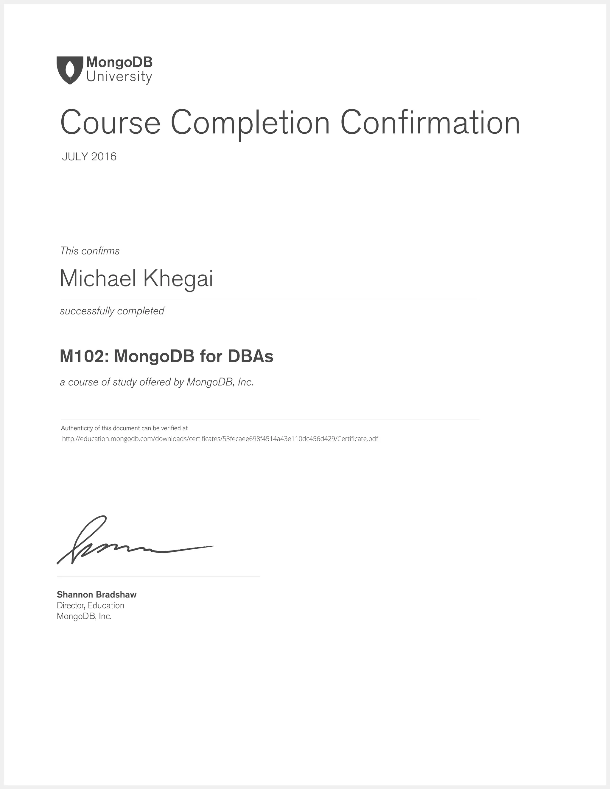 This document confirms that Michael Khegai successfully completed the M102: MongoDB for DBAs course offered by MongoDB, Inc. in July 2016. The authenticity of the completion confirmation can be verified by accessing the URL provided, which contains a downloadable certificate. Shannon Bradshaw, Director of Education at MongoDB, Inc., issued the confirmation.