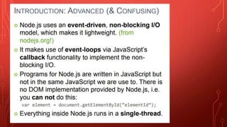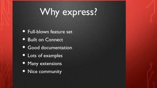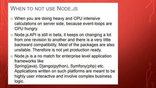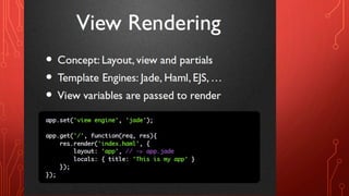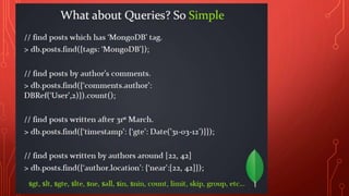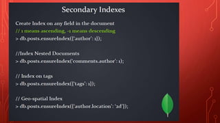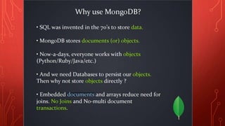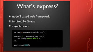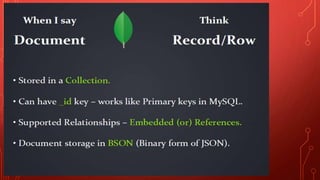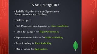 This document provides an overview of building a MEHN stack application from scratch. It discusses MongoDB concepts like CRUD operations, schemas, and connecting MongoDB to an application. It also covers using Express and Handlebars for the application framework. The presenter will demonstrate a full CRUD application in MongoDB with Express and Handlebars over the next two days, starting from initializing the project and building out functionality.