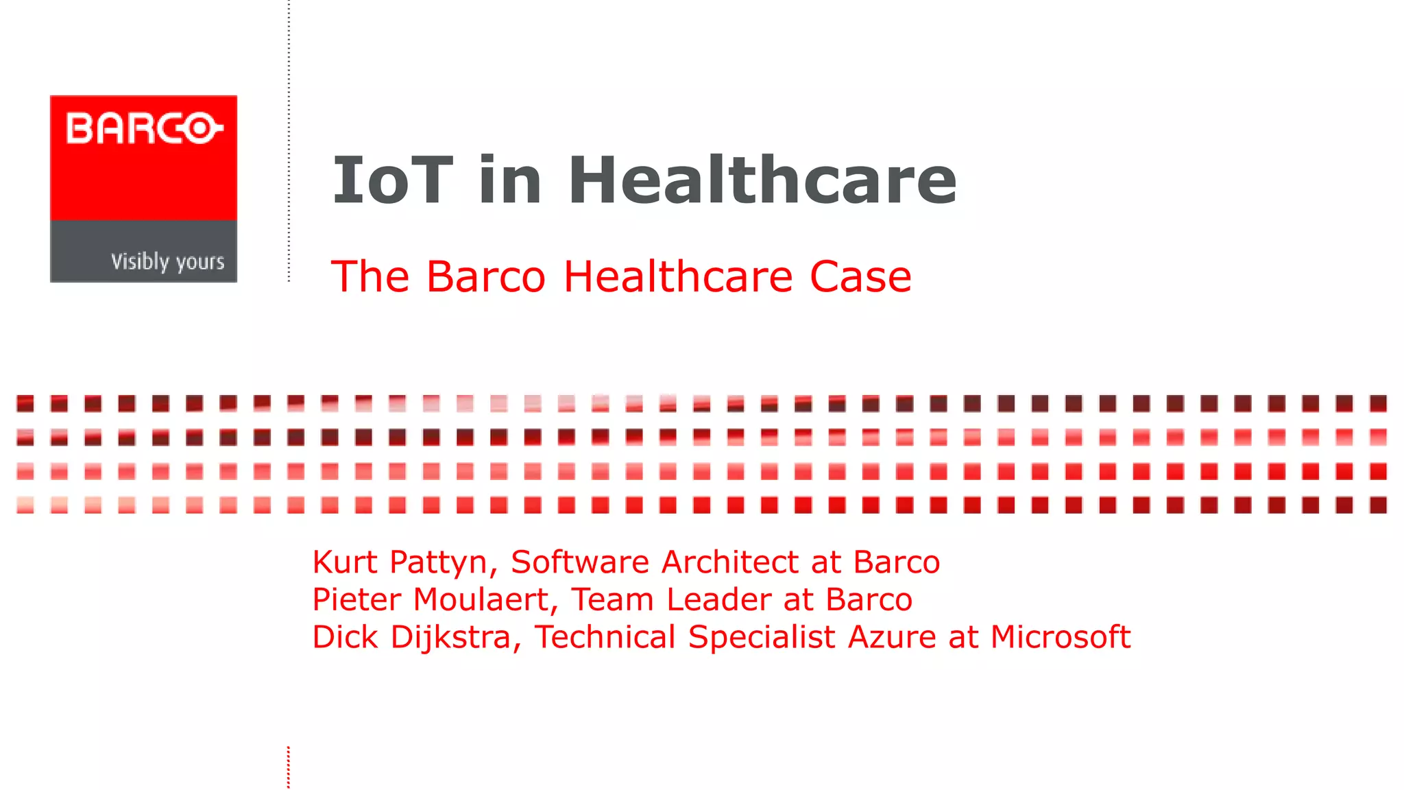 The document discusses the integration of IoT in healthcare, highlighting Barco's products that enhance clinical performance and collaboration while adhering to strict regulatory and privacy requirements. It details the capabilities of Microsoft Azure and MongoDB in supporting healthcare IoT by enabling data management, compliance reporting, and remote monitoring. Key considerations include stringent data protection laws and the growth in connected devices and data within healthcare facilities.