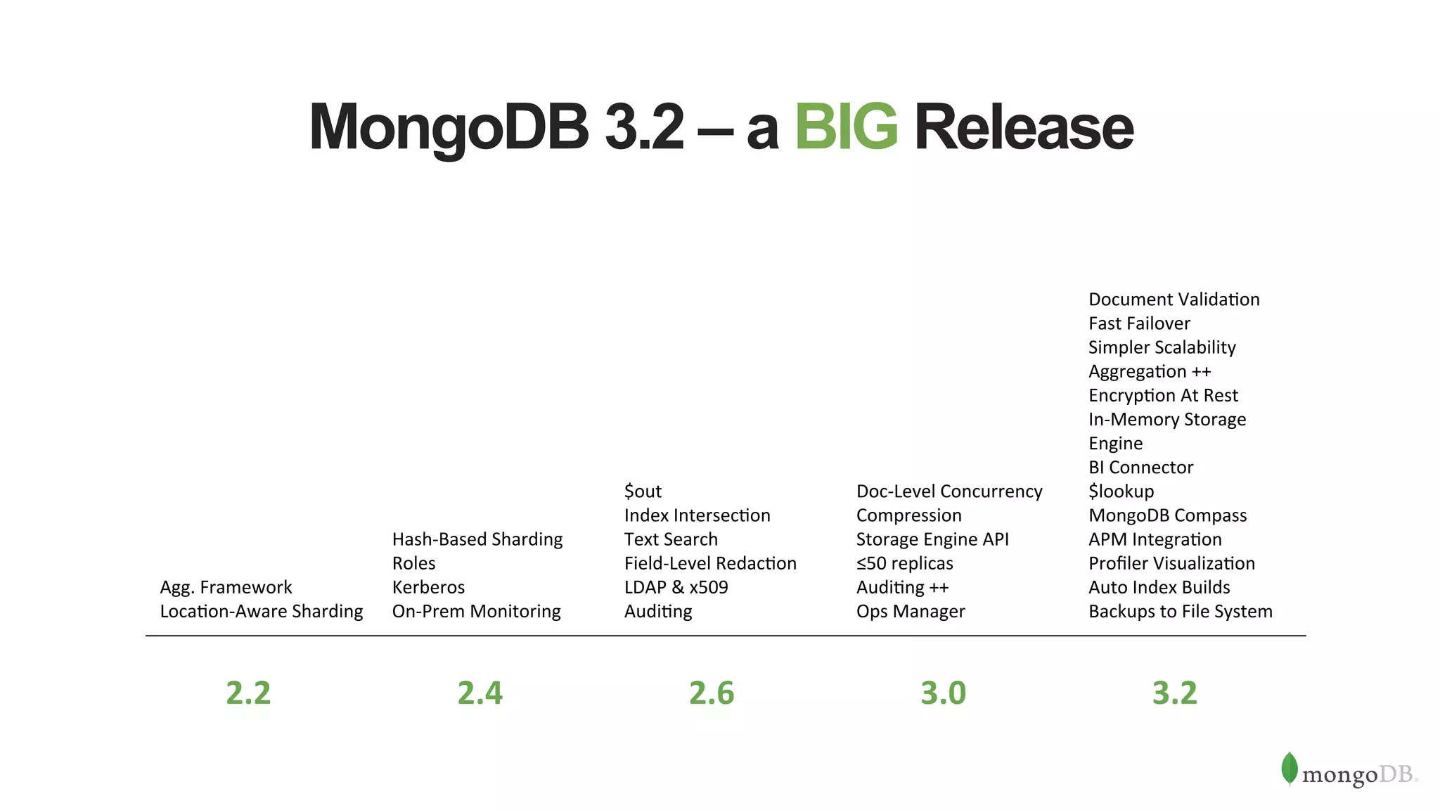 MongoDB 3.2 introduces significant updates including hash-based sharding, enhanced security features such as end-to-end encryption, and the WiredTiger storage engine as the default for improved performance. It offers tools for data analysts and administrators, facilitating real-time analytics, better document validation, and more efficient data governance without sacrificing flexibility. Additional features like the MongoDB BI connector and new aggregation operators enhance data processing capabilities for mission-critical applications.