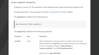 The document discusses different explain modes for MongoDB queries and aggregations. It begins with an overview of explain() and query plans, then covers the default "queryPlanner" mode which shows the winning and rejected plans. It also mentions the "executionStats" and "allPlansExecution" modes which provide more runtime statistics. The document aims to help understand how queries and aggregations are executed and troubleshoot performance issues.