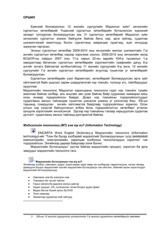 Ерөнхий боловсролын 12 жилийн сургуулийн Мэдээлэл зүйн* хичээлийн сургалтын хөтөлбөрийг Үндэсний сургалтын хөтөлбөрийн бүтэцчилсэн хүрээний загварт тулгуурлан боловсруулсан юм. Уг сургалтын хөтөлбөрийг Мэдээлэл зүйн хичээлийн сургалтыг зохион байгуулж байгаа багш нар, арга зүйчид, судалгаа шинжилгээний ажилтнууд болон сургалтанд хамрагдах сурагчид, эцэг эхчүүдэд зориулан гаргасан. Энэхүү сургалтын хөтөлбөр 2009-2010 оны хичээлийн жилээс шилжилтийн 7-р ангийн сургалтын хөтөлбөр нэрээр хэрэгжиж эхэлнэ. 2009-2010 оны хичээлийн жилд БСШУЯ-ны сайдын 2007 оны 11-р сарын 22-ны өдрийн 434-р тушаалын 1-р хавсралтаар баталсан сургалтын хөтөлбөрийн хэрэгжилтийн графикийн дагуу 6-р ангийг алгасч байгаатай холбоотойгоор 11 жилийн сургуулийн 6-р анги, 12 жилийн сургуулийн 7-р ангийн сургалтын хөтөлбөрийн агуулгад түшиглэж уг хөтөлбөрийг боловсруулсан. Сургалтын хөтөлбөрийн үзэл баримтлал, хөтөлбөрийг боловсруулсан арга зүйг ойлгомжтой байх үүднээс зарим шаардлагатай нэр томъѐо, түлхүүр үгс, тайлбаруудыг орууллаа. Мэдээллийн технологи, Мэдээлэл харилцааны технологи гэдэг нэр томъѐог тухайн ажиллаж байгаа салбар, аль өнцгөөс авч үзэж байгаа байр сууринаас хамааран маш олон янзаар тодорхойлсон байдаг. Дээрх нэр томъѐоны тодорхойлолтуудыг судалгааны ажлын тайландаа түшиглэн шинжлэх ухааны үг хэллэгээр биш ЕБ-ын түвшинд тохируулан энгийн ойлгомжтой байдлаар тодорхойлохыг зорилоо. Олон улсын нэр хүндтэй байгууллагын албан ѐсны тодорхойлолтыг хөтөлбөрт үгчилэн орчуулж хэрэглэхийг хичээсэнгүй. Эдгээр нэр томъѐоны талаар харьцуулсан судалгаа дүгнэлт судалгааны ажлын тайланд дэлгэрэнгүй байгаа. Мэдээллийн технологи (МТ) гэж юу вэ? (Information Technology) ENCARTA Word English Dictionary-д Мэдээллийн технологи (Information technology)-ийг “Тоон ба бусад хэлбэрèéí мэдээллийг боловсруулахын тулд àøèãëàäàã компьютерийн, электроникийн, харилцаа холбооны технологиудын хэрэглээ” гэж тодорхойлсон. Энгийнээр дараах байдлаар хэлж болно: Мэдээллийн бүтээгдэхүүн1 үүсгэж байгаа мэдээллийн процесс, хэрэгсэл ба арга замуудыг мэдээллийн технологи гэнэ. 1 Мэдээллийн бүтээгдэхүүн гэж юу вэ? Энгийнээр хэлбэл, хэвлэмэл, аудио, эсвэл видео зэрэг ямар нэг хэлбэрээр тэмдэглэгдсэн, нэгээс нөгөөд дамжуулж болдог мэдээллийн хэсгийг мэдээллийн бүтээгдэхүүн гэж ойлгоно. Хамгийн өргөн хэрэглэгддэг мэдээллийн бүтээгдэхүүнүүд: Хэвлэмэл ном ба электрон ном Товхимол ба тусгай тайлан Гарын авлага ба дадлага ажлын дэвтэр Aудио хуурцаг, CD, сүлжээнээс татаж болдог аудио файл Видео бичлэг бүхий хальс ба DVD Теле семинар Захиалгад суурилсан вэб сайтууд 3 ЕБ-ын 12 жилийн сургуулийн шилжилтийн 7-р ангийн сургалтын хөтөлбөрийн зөвлөмж