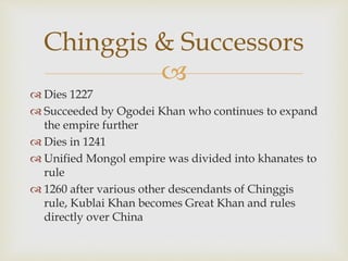 Chinggis Khan died in 1227 after expanding the Mongol Empire. He was succeeded by Ogodei Khan who continued expanding the empire. Ogodei died in 1241, after which the unified Mongol empire was divided into khanates ruled by various descendants of Chinggis. In 1260, Kublai Khan became Great Khan and ruled directly over China, establishing the Yuan Dynasty. The IL khanates were essentially sovereign states that pledged allegiance to Kublai Khan. Under Kublai Khan's rule, China experienced changes such as the establishment of a multi-religious empire, welfare programs, and encouraging farming.