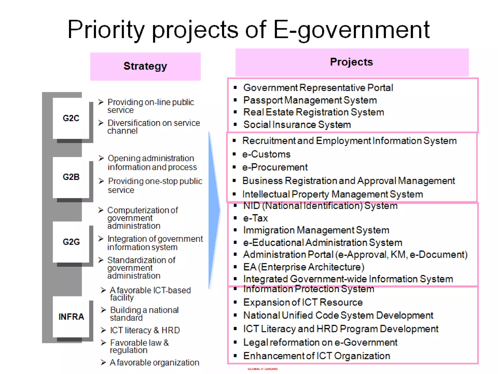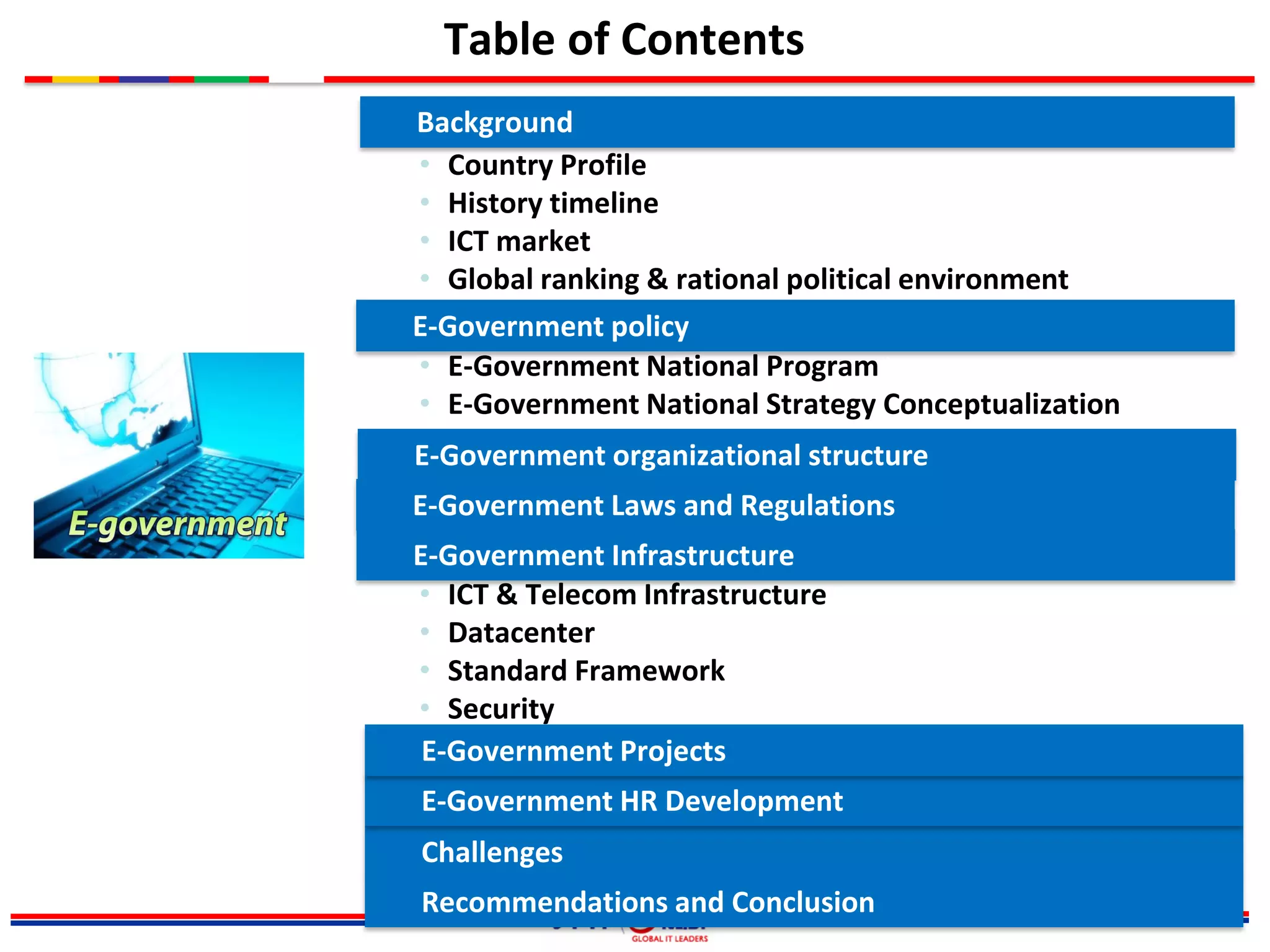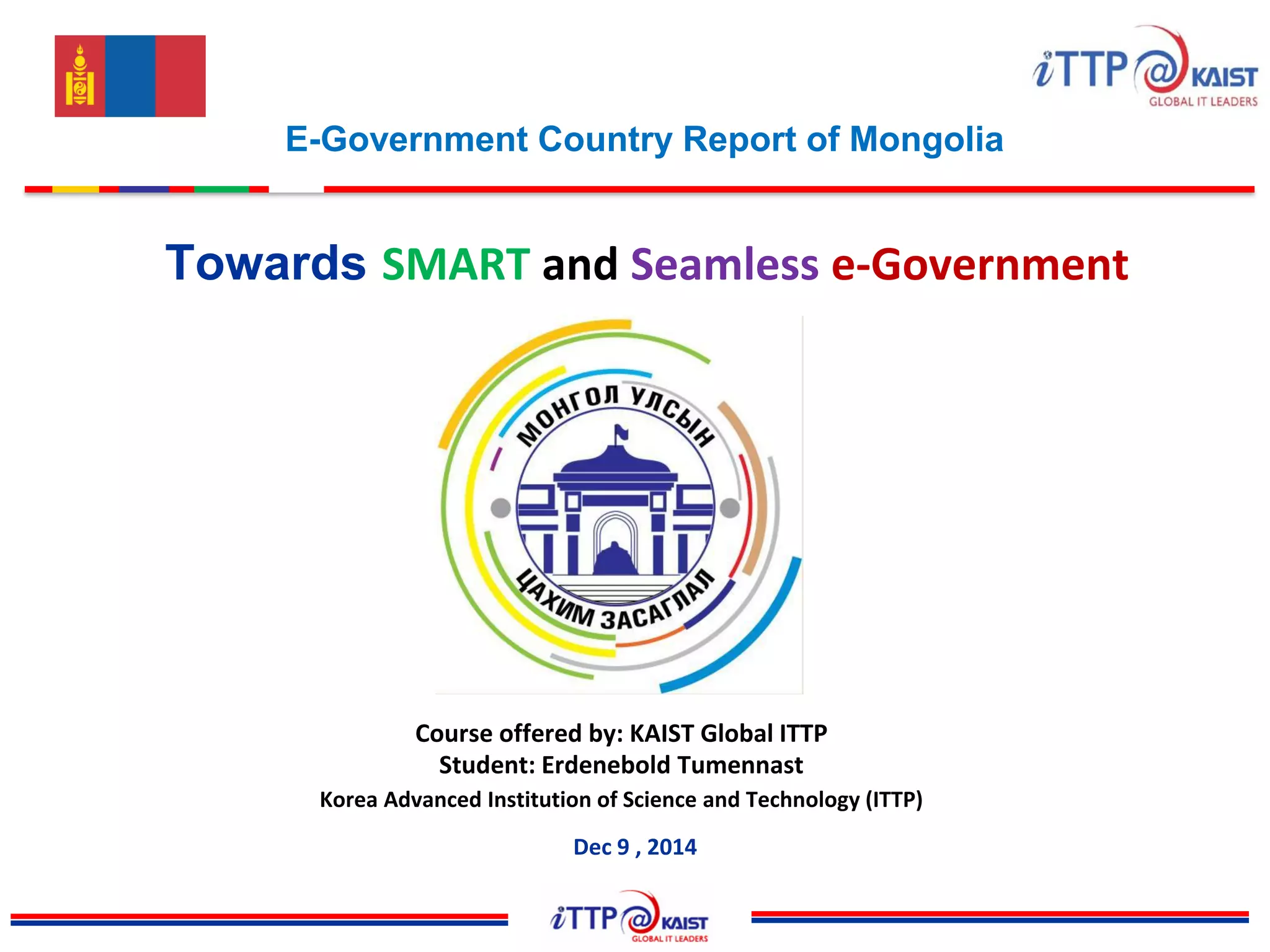 The document provides an overview of e-government initiatives in Mongolia. It summarizes Mongolia's country profile, history of ICT development, and current global ranking for e-government. It then outlines Mongolia's e-government national program and strategy, organizational structure, laws/regulations, infrastructure including telecom networks and the national data center, projects implemented, and challenges faced. Recommendations provided include renewing the long-term ICT strategy, establishing an ICT ministry, expanding rural access, prioritizing key sectors like health and education, and addressing issues like interoperability, security, and the digital divide.