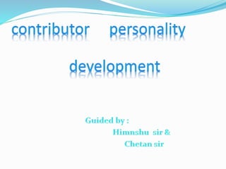 Raghubhai Jasani is the sarpanch of Village Shedhavadar and a farmer. He works to educate villagers about the benefits of government programs and attends seminars to learn how technology is changing agriculture. As sarpanch, he strives to provide the village with amenities like electricity, water, and roads, and earned it an award as a clean village. He promotes education for girls and hopes to change mindsets, though progress has been gradual. A memorable moment was the construction of a bridge solving travel issues. As sarpanch, he feels a responsibility to those who trust in him. He displays characteristics of a contributor through his various efforts.