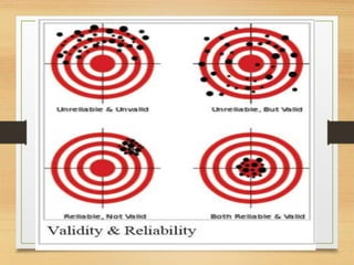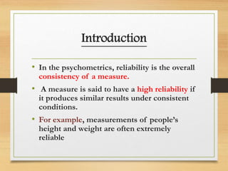 Reliability refers to the consistency of a measure. There are several types of reliability: test-retest, equivalency, inter-rater, and internal consistency. Test-retest reliability assesses consistency over time, equivalency assesses consistency between alternate forms, inter-rater assesses consistency between raters, and internal consistency assesses consistency between items. Factors like memory, practice effects, and maturation can impact reliability over time. Reliability is important for a measure to be valid and useful. Ways to improve reliability include making tests longer, carefully constructing items, and standardizing administration procedures.