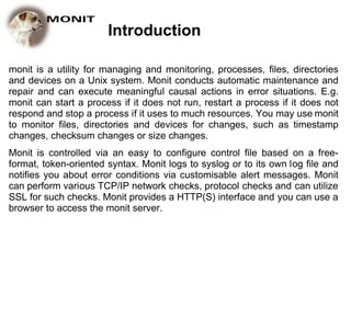 Monit is a utility for monitoring and managing processes, files, directories, and devices on Unix systems. It conducts automatic maintenance and repair tasks, and can execute actions in error situations. Monit is configured via a control file with entries for global settings and specific services to monitor. It provides alerts, logging, and a web interface for monitoring the system.