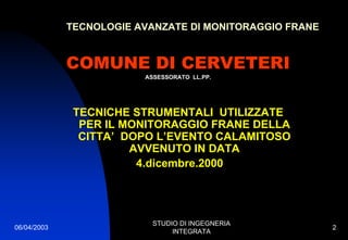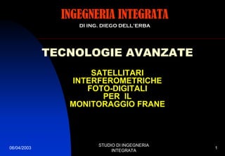 Il documento descrive l'utilizzo di tecnologie satellitari avanzate per il monitoraggio delle frane, evidenziando l'importanza di sistemi come GPS e interferometria radar per la previsione e prevenzione di eventi franosi. Viene illustrata l'architettura della rete di monitoraggio e vari strumenti impiegati, inclusi ricevitori GPS e antenne. Inoltre, vengono presentate applicazioni pratiche e risultati relativi alla rilevazione di movimenti del terreno attraverso tecniche di analisi delle immagini SAR.