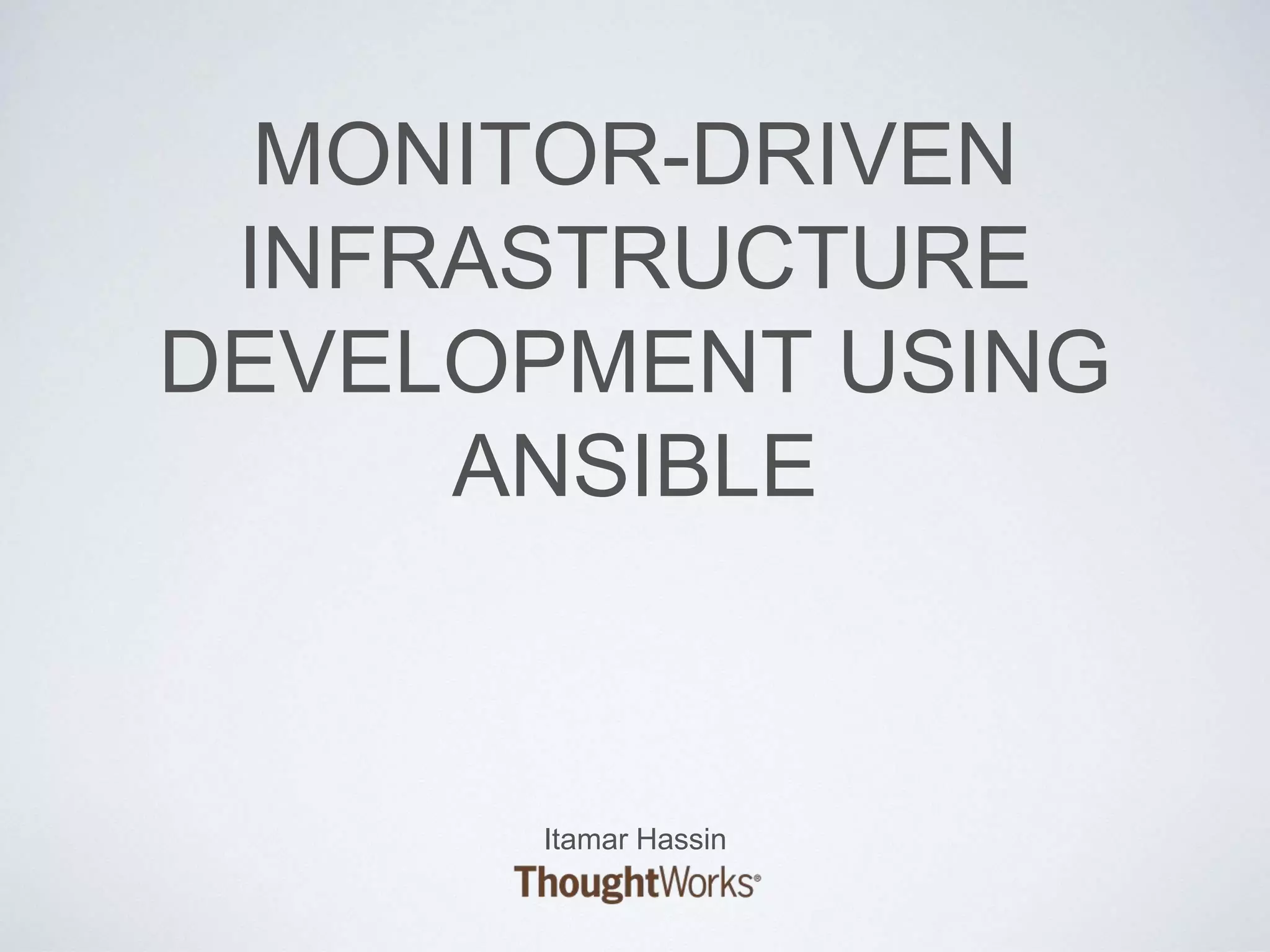 The document discusses best practices for using Ansible in infrastructure development, emphasizing the importance of treating Ansible scripts with the same rigor as application code, including automated testing and version control. It details the necessity of automation to ensure scalability and consistent environments while promoting collaboration between developers and sysadmins. Key practices include employing Test-Driven Development (TDD), using Serverspec for testing, and integrating continuous integration (CI) methodologies into the deployment process.