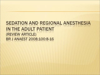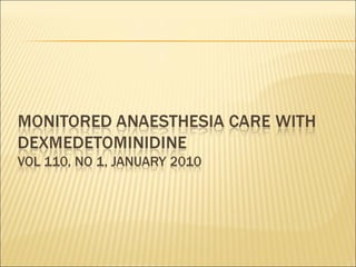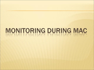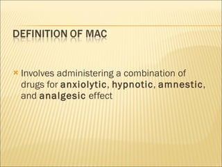 The document discusses monitored anesthesia care (MAC), which involves administering drugs to provide anxiolytic, hypnotic, amnestic, and analgesic effects without depressing consciousness below a certain level. It provides guidelines on drug selection and dosing for MAC, including opioids like fentanyl and remifentanil, benzodiazepines like midazolam, propofol, ketamine, and dexmedetomidine. It also discusses factors that can lead to patient agitation during MAC and principles of drug administration via continuous infusion or patient-controlled methods.
