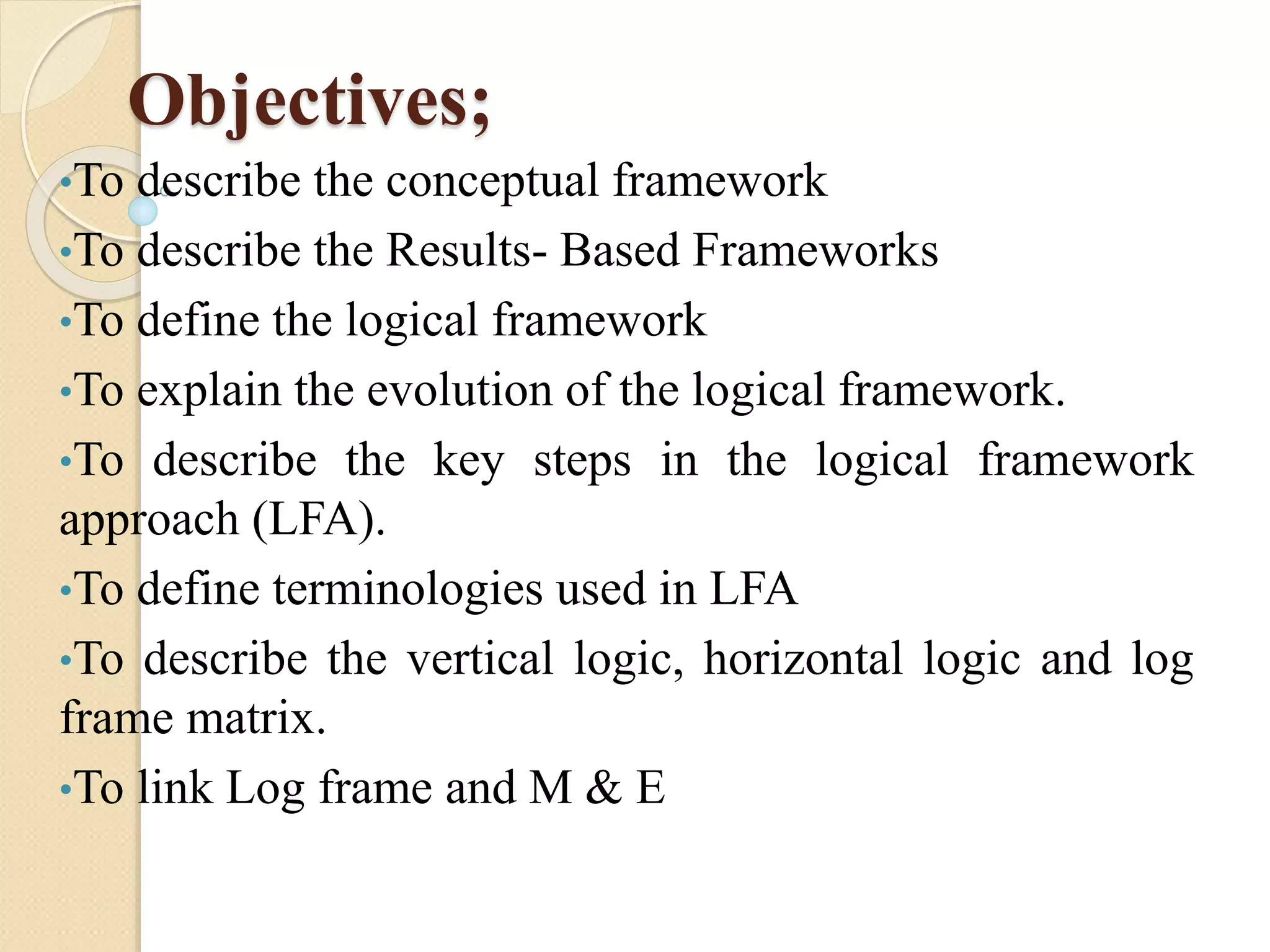 The document outlines various monitoring and evaluation frameworks including conceptual frameworks, results frameworks, and the logical framework approach (LFA), which are essential for the planning, implementation, and assessment of projects. It discusses the significance of these frameworks in understanding relationships among project components, identifying objectives and strategies, and linking outputs to desired outcomes. Furthermore, it emphasizes the importance of stakeholder engagement and the iterative nature of project design and evaluation.