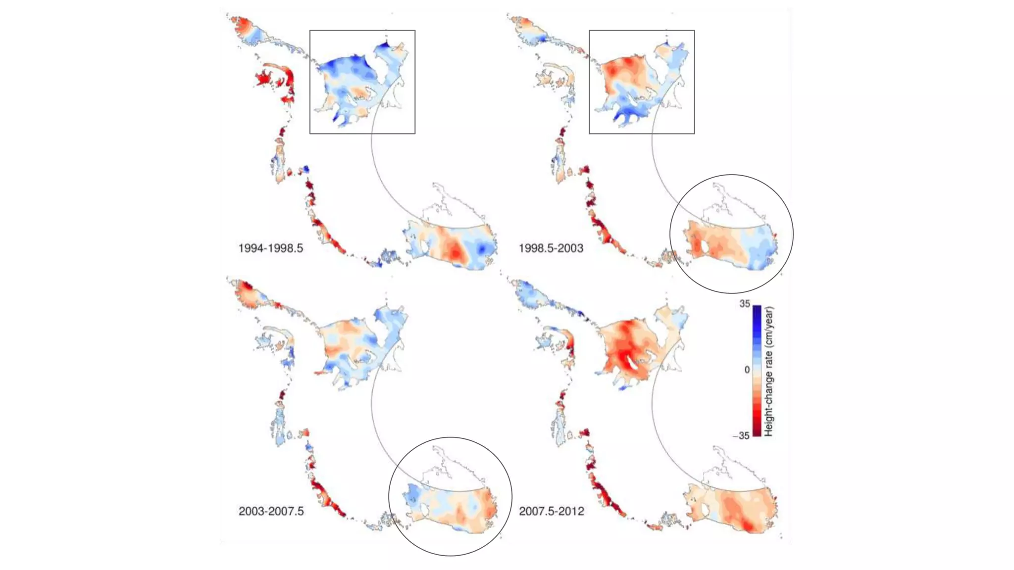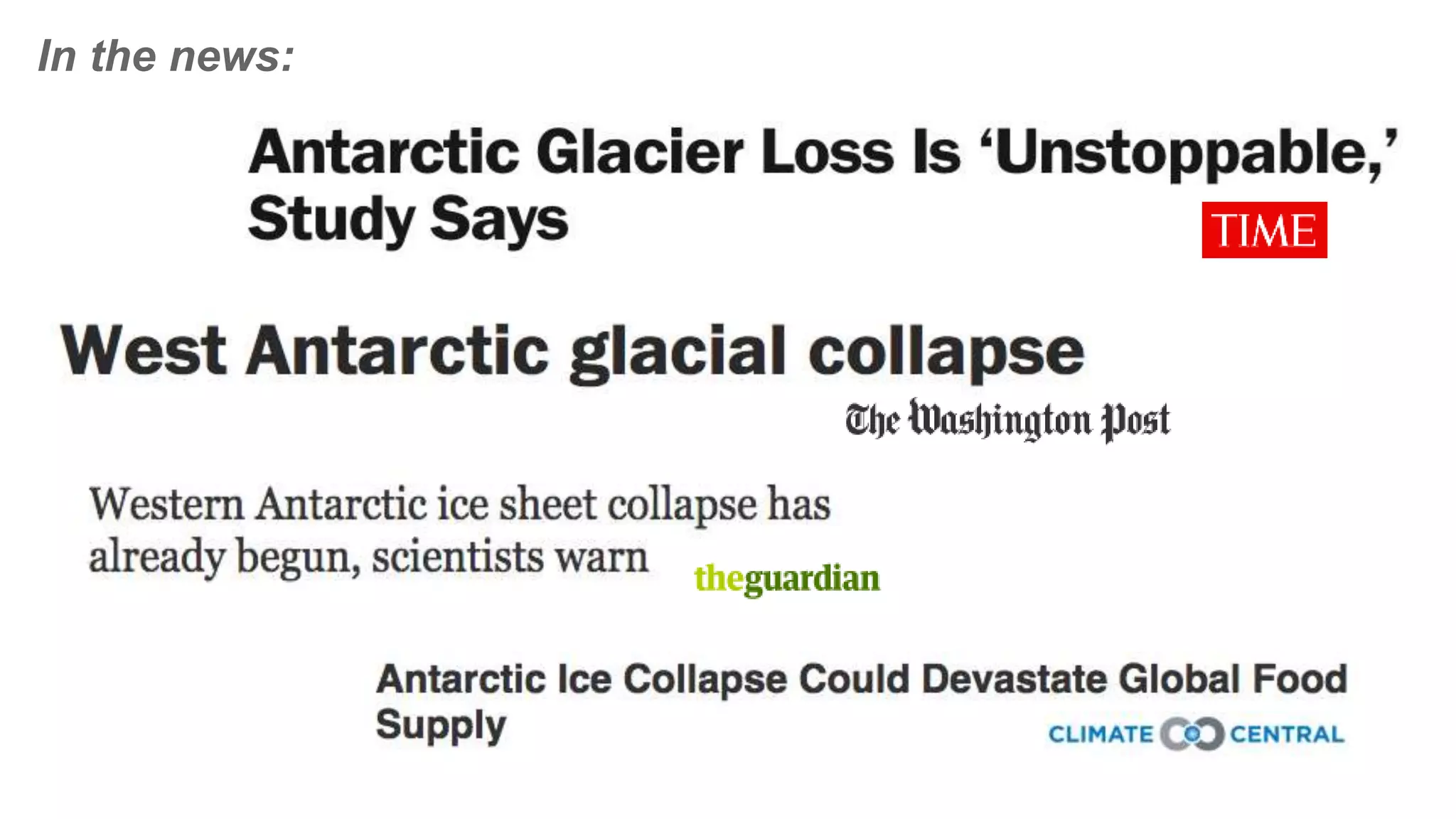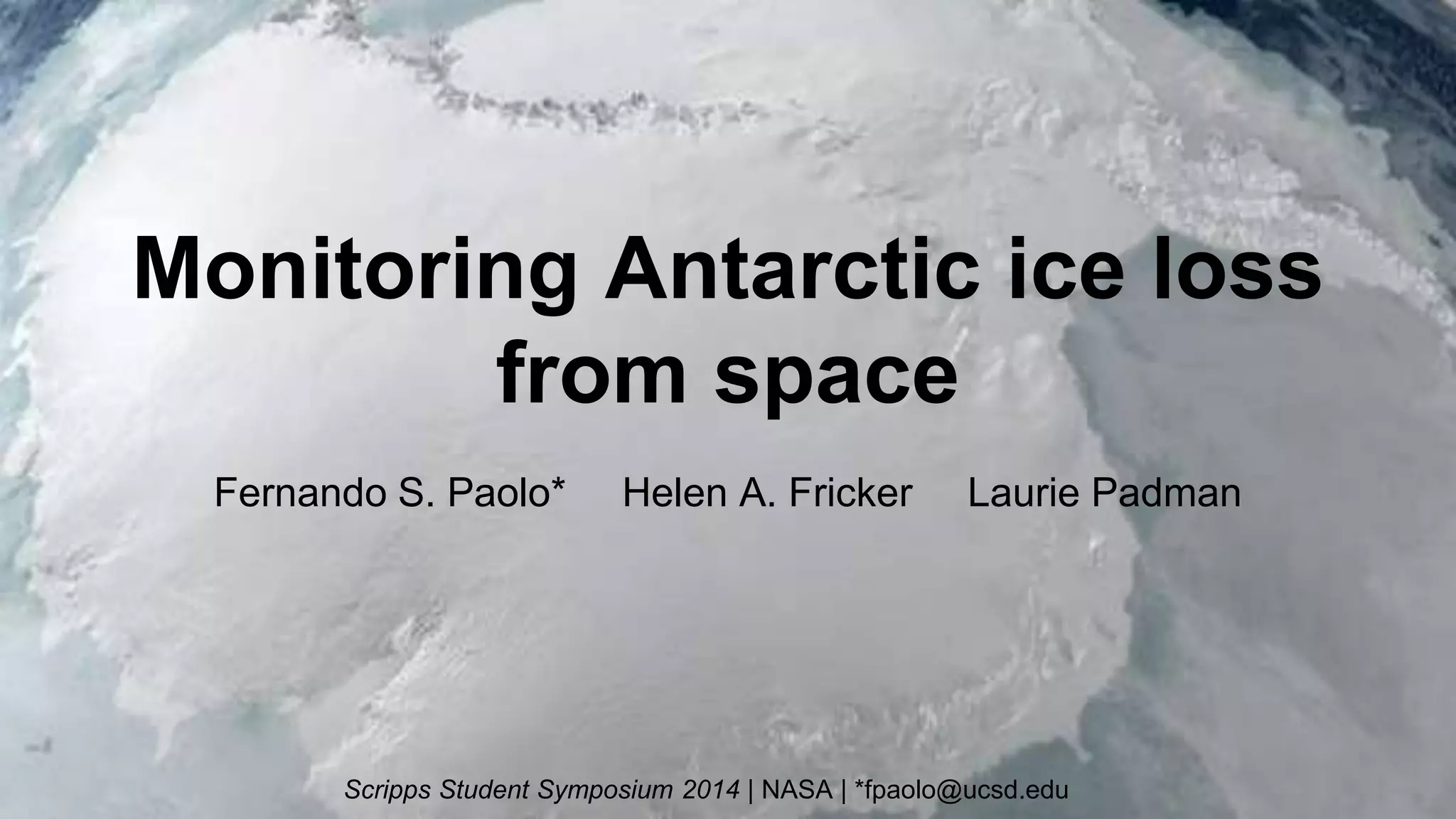 This document summarizes a talk about monitoring ice loss in Antarctica from space. Satellite observations over 18 years show that West Antarctica is losing ice at an accelerated rate of 0.7-1.5 meters per year. The stability of Antarctic ice sheets depends on floating ice shelves, but ocean warming is causing ice shelves to weaken and retreat, leading to increased ice loss from the continent and raising sea levels. Predicting future sea level rise depends on understanding the behavior of Antarctic ice sheets in response to climate change.