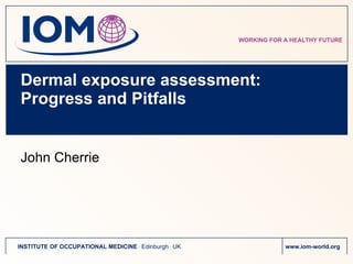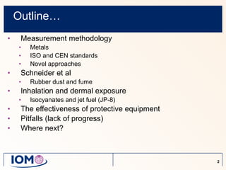 The document outlines the current status and challenges of dermal exposure assessment in occupational health, discussing methodologies for measurement and existing standards. It emphasizes the significance of studying dermal exposure routes, the effectiveness of protective gear, and the need for better collaboration and understanding in the field. The document highlights the limited progress made in accurately measuring biologically relevant exposures and calls for a focused research agenda to advance dermal exposure science.