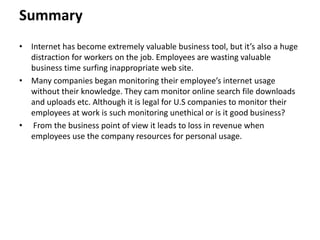 This document discusses the debate around whether monitoring employee internet usage is unethical or good business. While the internet provides a valuable business tool, employees often waste time on non-work related activities. Many companies monitor employee internet usage without their knowledge to track searches, files, and activity. This raises issues around ethics versus protecting company resources and information. The document also examines different company policies regarding internet monitoring and acceptable usage of corporate networks and resources.