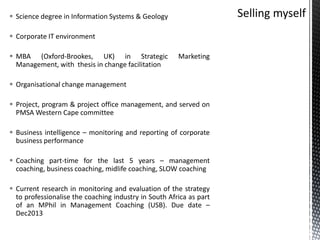 Jacques Myburgh is an existential coach who has a science degree in information systems and geology, an MBA from Oxford Brookes University, and experience in organizational change management, project management, and business coaching. He is currently researching the monitoring and evaluation of strategies to professionalize the coaching industry in South Africa for his MPhil in Management Coaching. The workshop he is presenting introduces a results-based evaluation framework for determining the efficiency and effectiveness of projects using stakeholder perspectives and mapping activities to intended results and impacts.