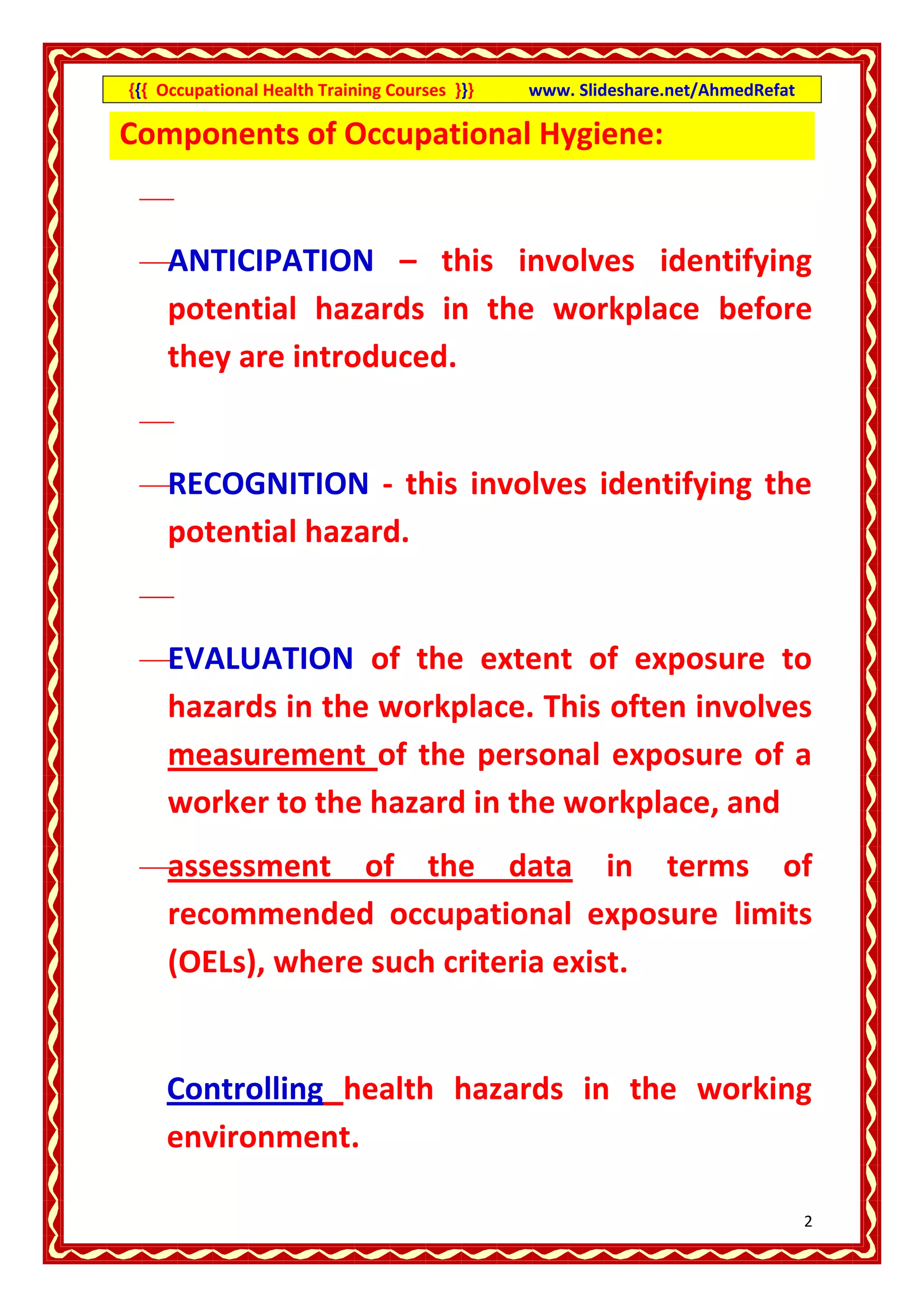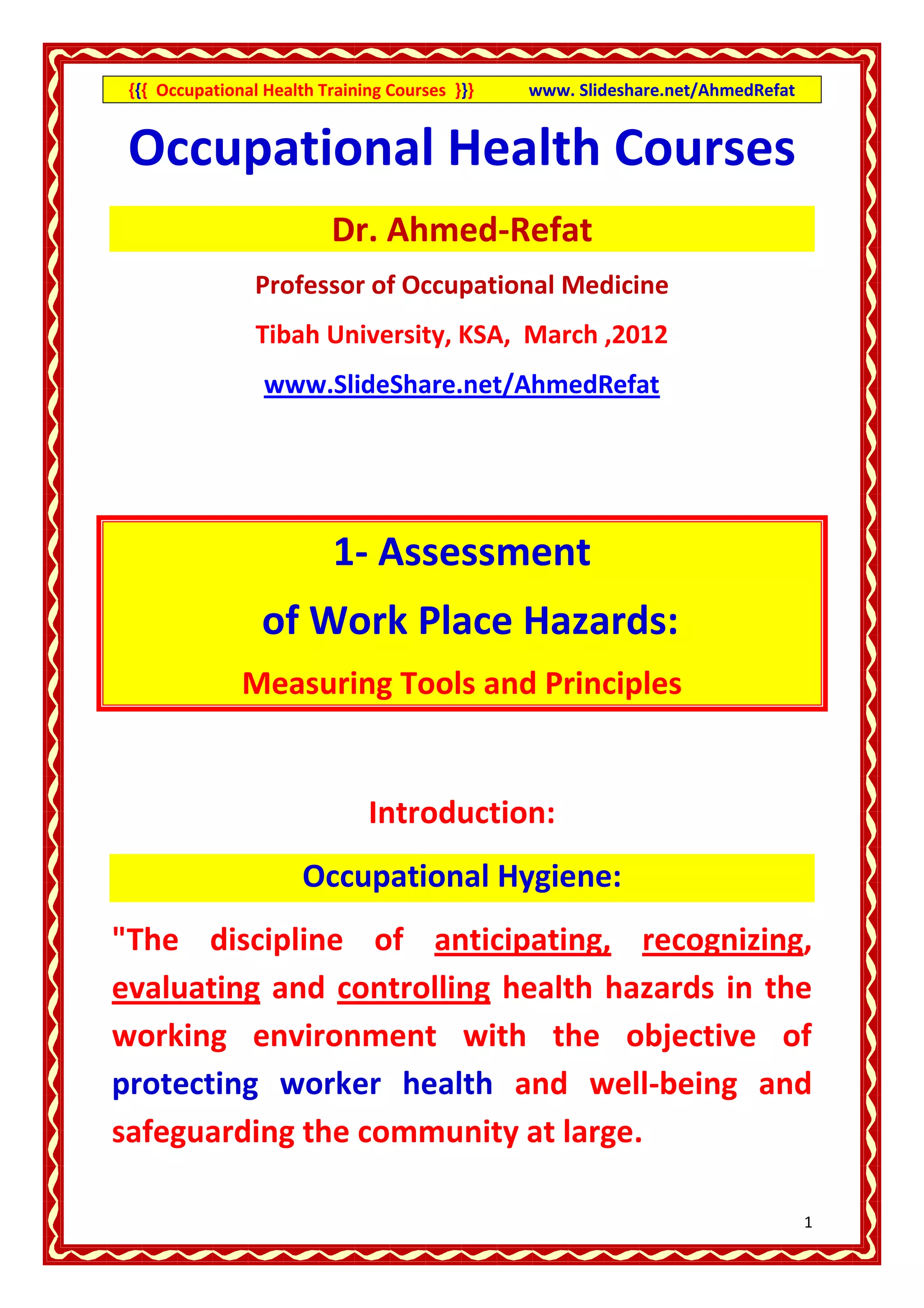 This document provides an overview of occupational health training courses focusing on assessment of workplace hazards. It discusses measuring physical hazards like noise, light, heat and thermal environment. Noise is measured using a sound level meter in decibels while light is measured in lux units using a lux meter. Heat stress and strain are also explained. Methods for measuring chemicals hazards like vapors, fumes and dust are outlined. Sampling techniques including grab, short term and long term sampling are covered. Hygiene standards used to evaluate exposure levels like TLVs are also mentioned.