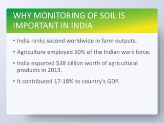 The document discusses the importance of soil monitoring in India, which is crucial for the agricultural sector that employs 50% of the workforce and significantly contributes to the GDP. It outlines the objectives of measuring soil parameters like moisture, temperature, pH, and nutrient levels (NPK) using specific hardware components such as sensors and Arduino microcontrollers. While soil monitoring can improve soil quality and crop yields, it also has disadvantages like the need for sensor calibration and reliance on network connectivity.