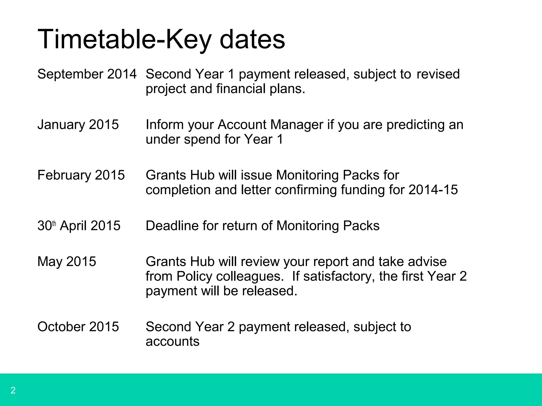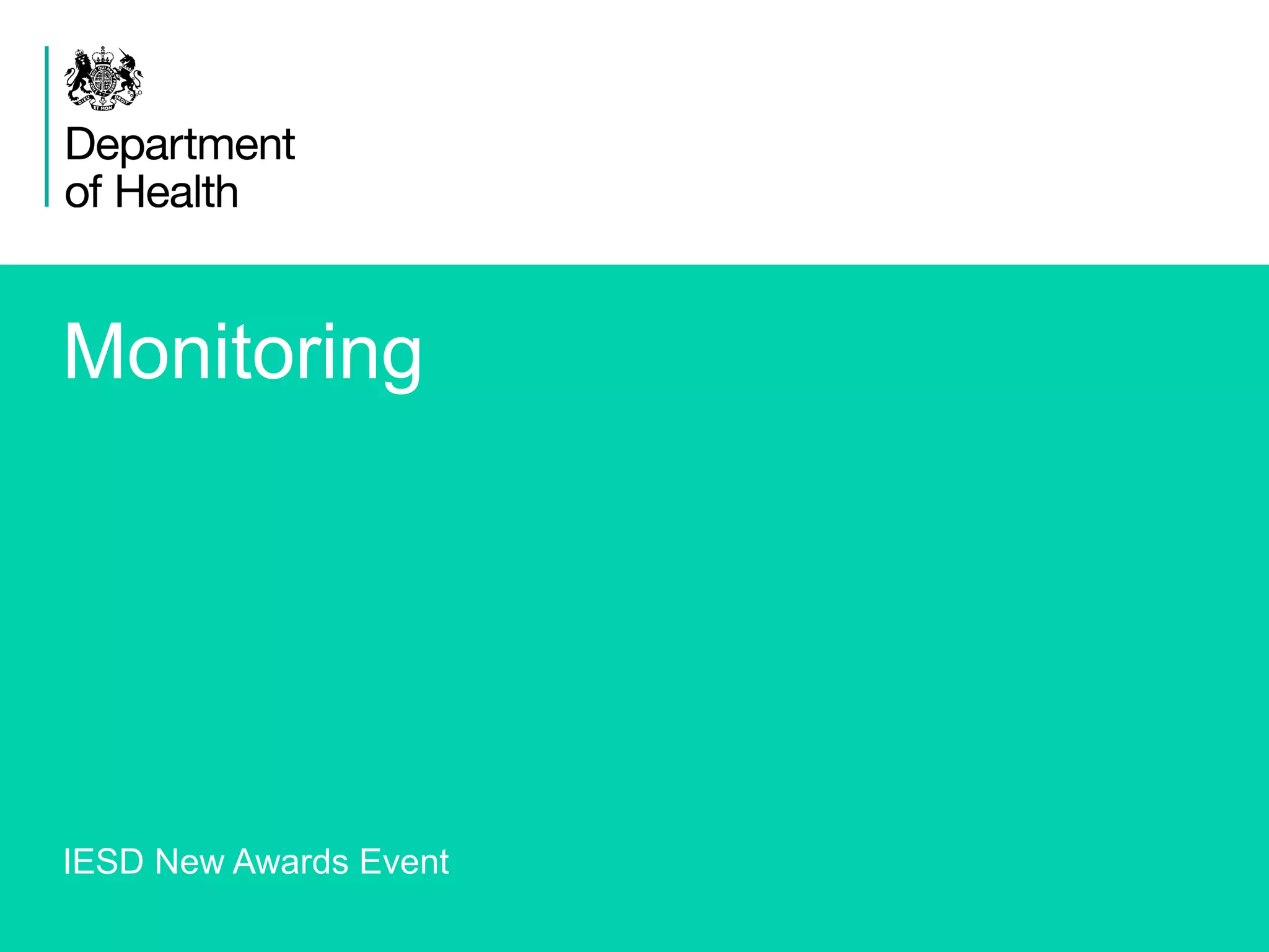 This document outlines the key dates and requirements for monitoring grant funding from the IESD New Awards Event. It provides the timeline for grant payments in 2014-2015 along with the deadline for returning completed Monitoring Packs. It describes what information the Monitoring Packs should include like progress on outcomes from the application and facts/figures to demonstrate achievement. The monitoring process aims to evaluate if projects are on track with their plan, budget, and continuing to meet Department of Health priorities and service user needs. Risk management and long-term sustainability are also areas of focus.