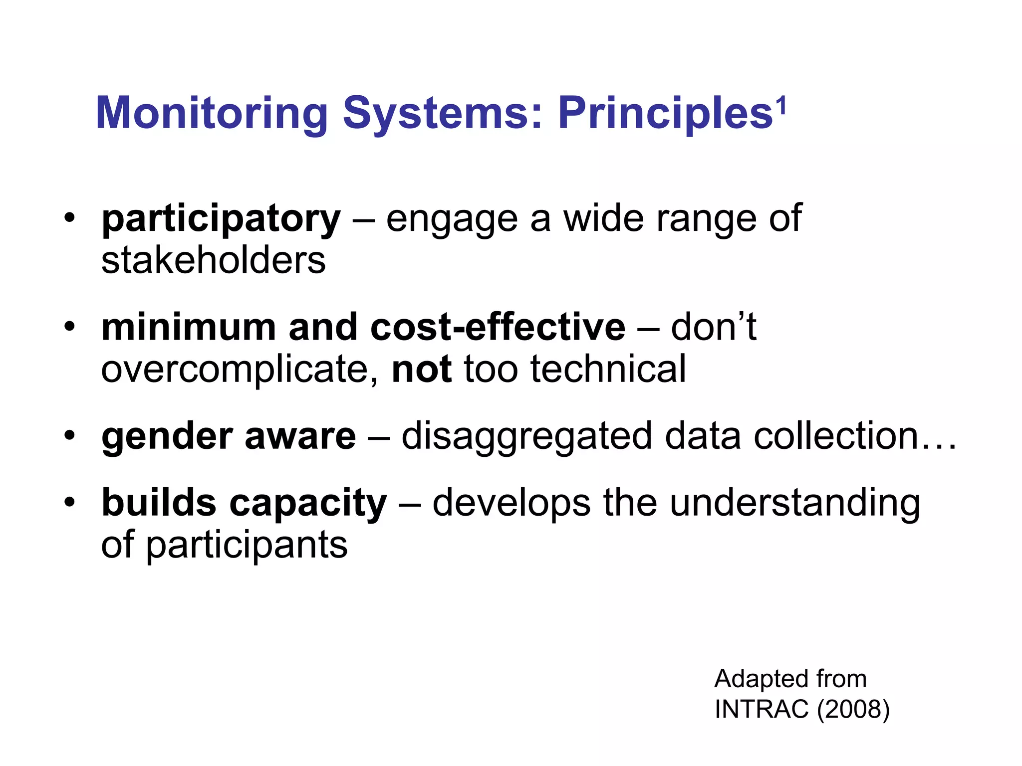 The document outlines principles for developing effective monitoring systems including engaging stakeholders, having a clear theory of change, defining information requirements, assigning responsibilities and resources, building partner capacity, and facilitating learning. It provides examples of tools that can be used like data collection tables, monitoring schedules, indicator tracking tables, and capacity assessments.