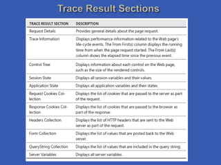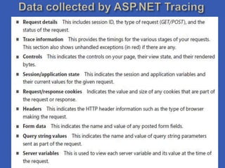This document discusses various debugging and troubleshooting techniques for ASP.NET applications, including setting breakpoints, enabling debugging in projects and web configs, configuring custom errors, remote debugging, debugging client scripts, tracing, and more. It provides step-by-step instructions for tasks like enabling the ASP.NET debugger, configuring tracing, and using the Sys.Debug namespace to trace AJAX requests.