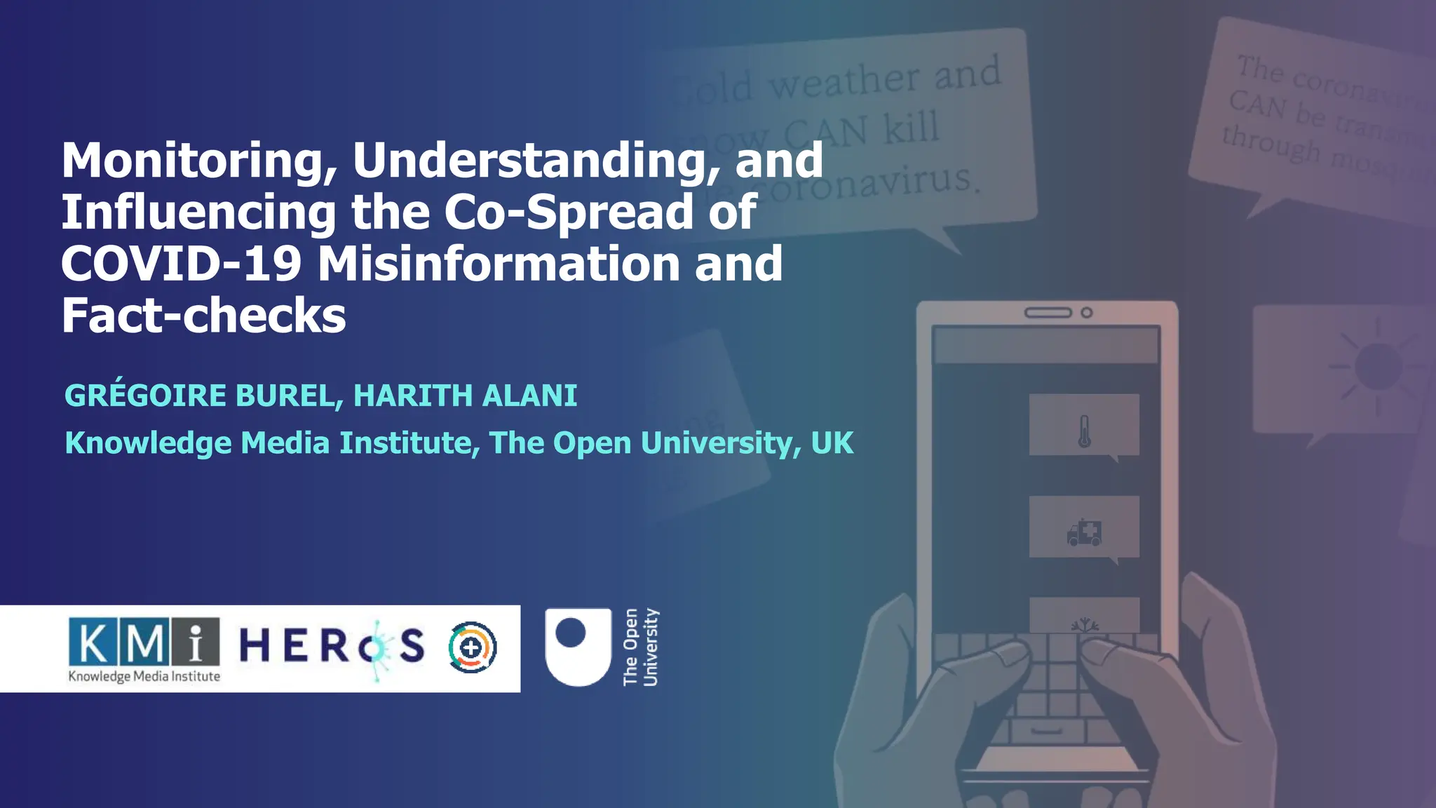 The document discusses monitoring, understanding, and influencing the spread of COVID-19 misinformation and fact-checks online. It describes: