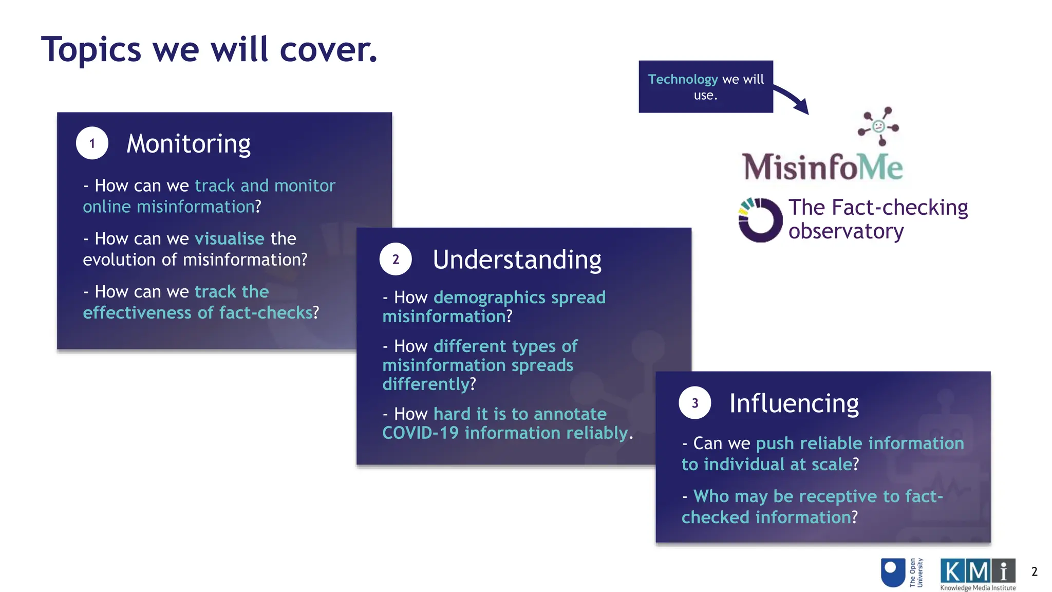 1) The Fact-checking Observatory which tracks the spread of COVID misinformation and fact-checks on Twitter, generates weekly reports on topics and reach, and provides visualizations of trends over time.