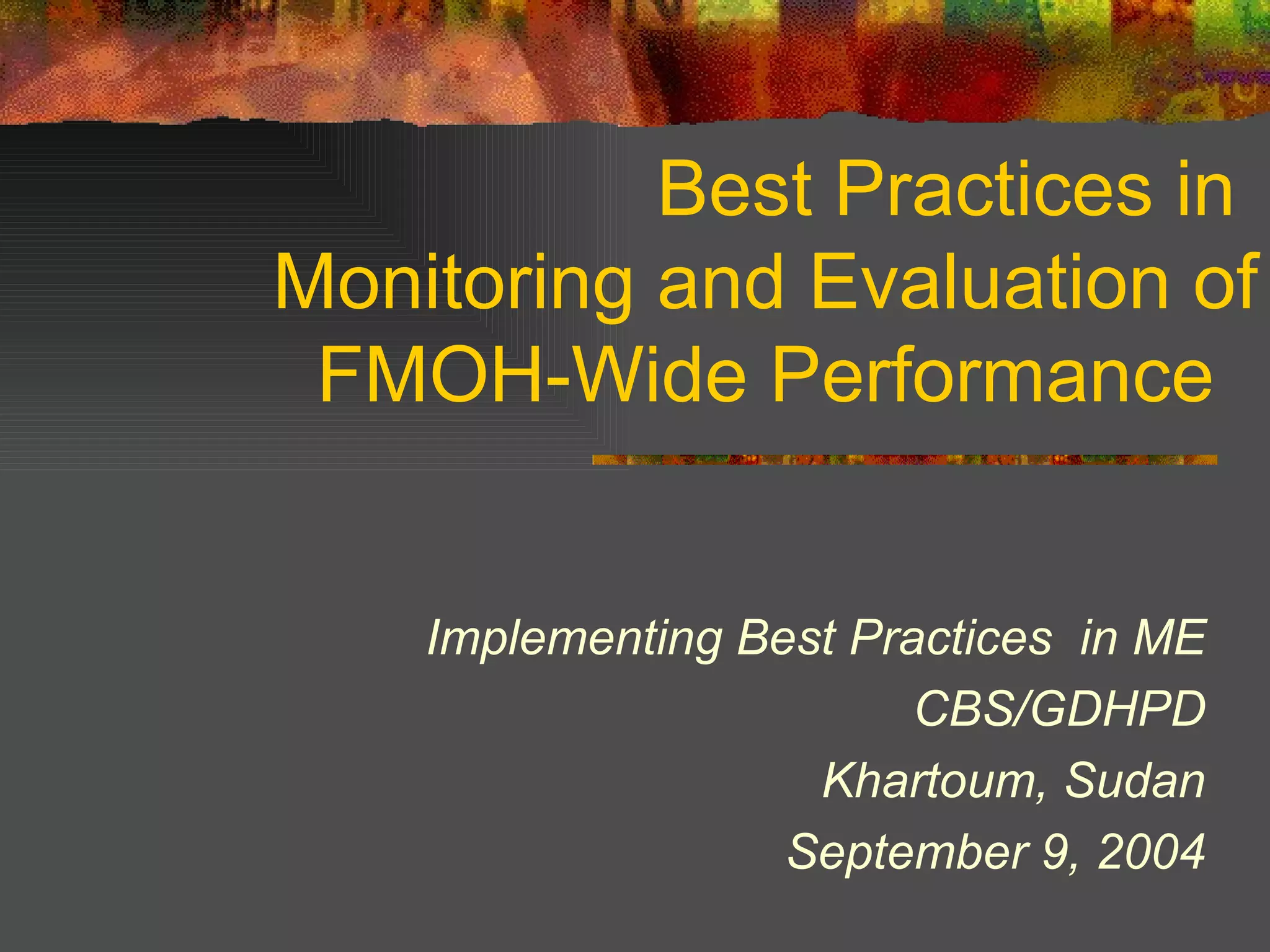 The document discusses best practices in monitoring and evaluation (M&E) for health programs. It defines M&E, outlines an 8-step process for developing an M&E plan, and emphasizes using M&E for continuous program improvement. Key aspects of an M&E plan include indicators, data collection methods, targets, and an iterative cycle of data collection, analysis, and action planning. The overall goal of M&E is to enable evidence-based decision making.