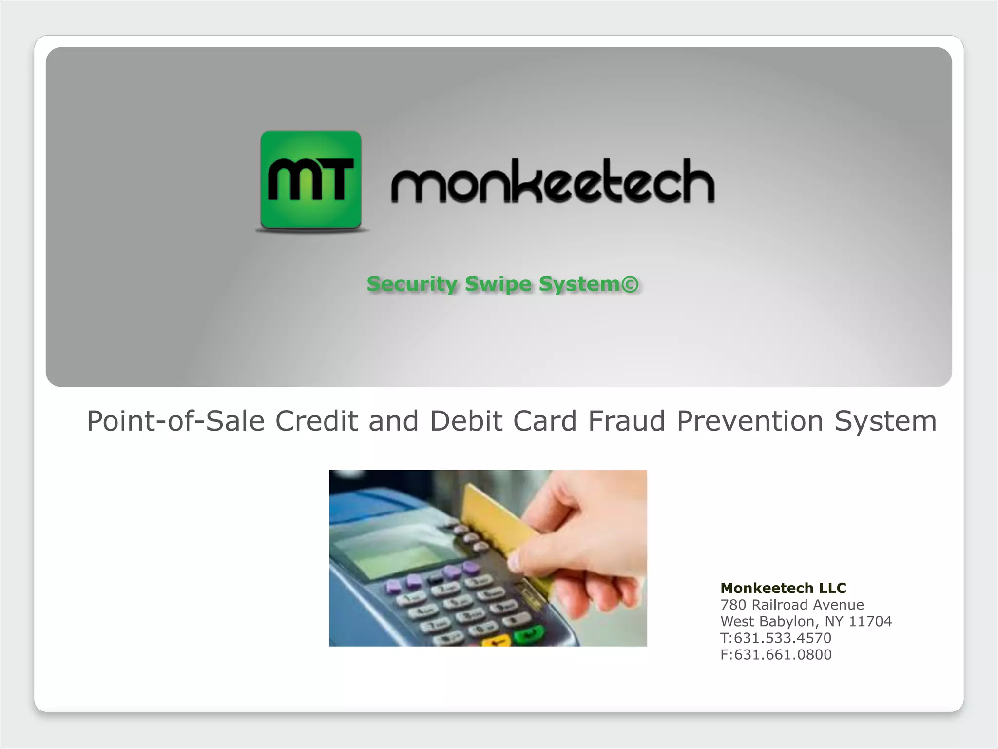The Security Swipe System is a point-of-sale credit and debit card fraud prevention system that uses high resolution digital images and SMS text notifications. When a card is swiped at a terminal, images of the transaction are captured, time stamped, and stored on a remote server. The system also notifies opted-in cardholders via SMS text. If a transaction is not confirmed, the merchant is alerted of potential fraud. The images and data collected can then aid in identifying defrauders and possible prosecution.