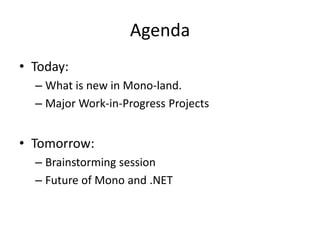 Mono 3.2 includes support for .NET 4.5, C# 5, and improvements to the SGen garbage collector. Major work-in-progress projects include PlayScript, a language like ActionScript for games, and CppSharp for improved C++ interop. Future work may allow inline assembly in C# and focus on community priorities identified in tomorrow's brainstorming session.