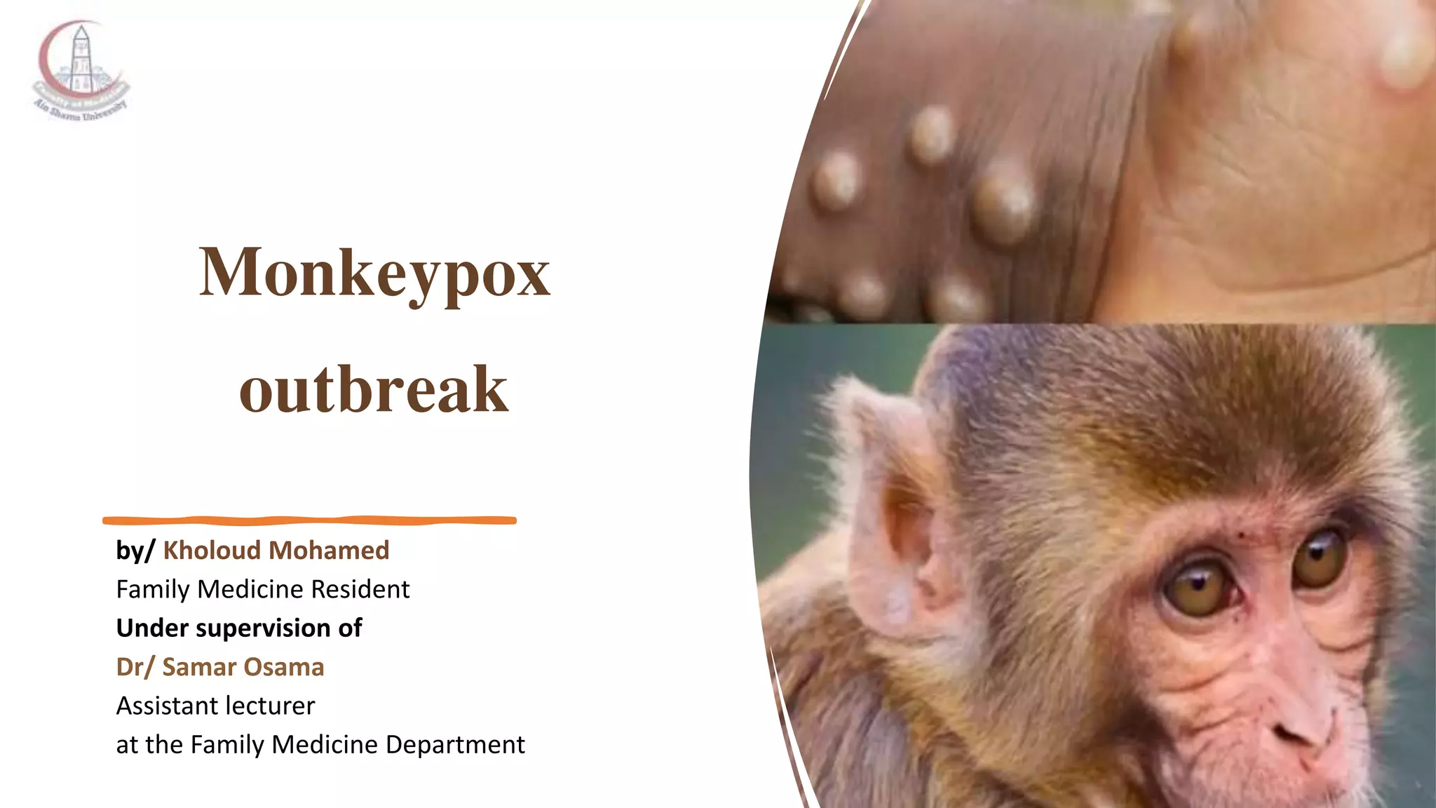 The document discusses the monkeypox virus, its epidemiology, transmission modes, and outbreaks, including significant events from 2003 to 2022. It emphasizes the importance of prevention, vaccination, diagnosis, and treatment approaches, as well as the role of family physicians in case management. Additionally, the document outlines the public health response to outbreaks, contact tracing protocols, and patient isolation measures.