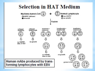 This document discusses monoclonal antibodies (mAbs), including their definition, production process, structure, applications, and limitations. It describes how mAbs are produced through the fusion of immune spleen cells from immunized mice with myeloma cells, which results in hybridoma cells that can produce identical antibodies. The key steps involved are immunizing mice, screening for antibody production, preparing myeloma cells, fusing cells, cloning hybridomas, and selecting cells in HAT medium. mAbs have various analytical, preparative, and therapeutic applications, but also have limitations such as immunogenicity and production challenges.