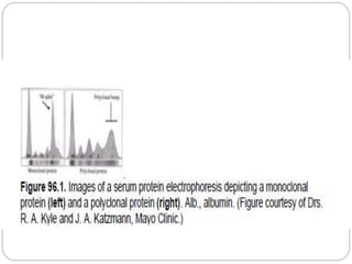 Immunofixation, Immunoelectrophoresis, and Immunodiffusion  Structuraltype of a monoclonal protein is determined best by immunofixation  Thus immunofixation should be performed whenever a monoclonal protein of unknown identity is detected with SPEP  Immunofixation may also be performed when a B-cell or plasma cell neoplasm is suspected but no monoclonal spike is apparent, as is frequently the case with AL or nonsecretory MM  Immunofixation may also be used to monitor for disease relapse in patients who have achieved a complete response to therapy