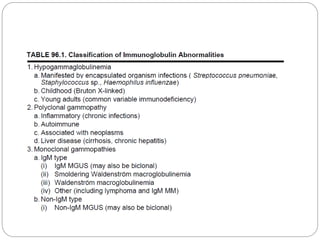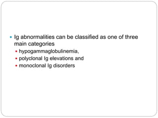  Ig abnormalitiescan be classified as one of three main categories  hypogammaglobulinemia,  polyclonal Ig elevations and  monoclonal Ig disorders
