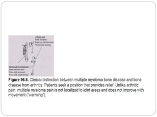 BONE DISEASE  Bonedestruction is an integral part of MM and is seen in at least 70% of patients.  When more sensitive tests are used, nearly all patients have evidence of bone destruction, and its complications  Bone disease associated with MM may involve the extremities, but most frequently it involves the spine.  A characteristic feature is that movement and weight bearing exacerbate the pain