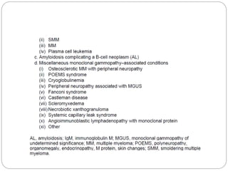 IMMUNOGLOBULIN ABNORMALITIES: METHODS OF DETECTION Clinical Scenarios  Monoclonal Ig disorders are diagnosed in the asymptomatic stage, with many of the patients having MGUS or SMM  These patients require no immediate therapy and must be distinguished from those with active MM.  Monoclonal protein may be detected when the clinical suspicion of MM is high  One has to be alert to the possibility that in a small fraction of patients with MM (<2%), no monoclonal protein can be detected in the serum or urine