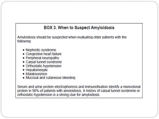  Other featuresinclude post proctoscopic periorbital purpura (4P sign), carpal tunnel syndrome, macroglossia, jaw claudication, orthostatic hypotension, diarrhea, and muscle pseudohypertrophy.  Tissue diagnosis of AL should be sought, including Congo red staining of suspicious amyloid deposits  In some patients, AL is diagnosed on the basis of symptoms, and then tests for monoclonal protein