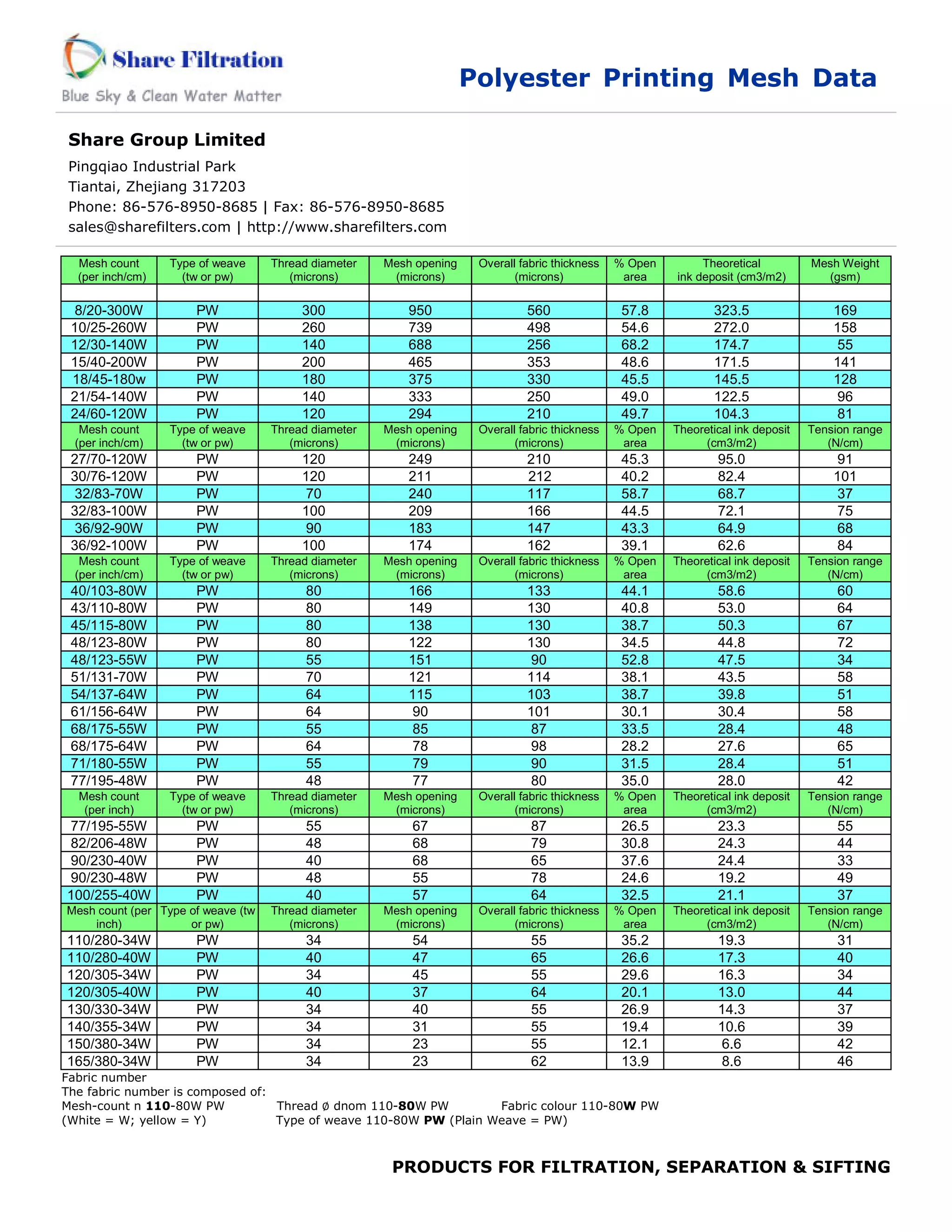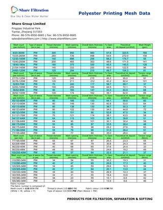 This document provides specifications for various polyester printing mesh fabrics, including mesh count, thread diameter, mesh opening size, thickness, open area percentage, theoretical ink deposit volume, weight, and tension range. It contains technical data for over 50 mesh fabrics with counts ranging from 8-165 per inch and thread diameters ranging from 23-300 microns. The document is from a company called Share Group Limited that manufactures and sells polyester printing mesh and filtration products.