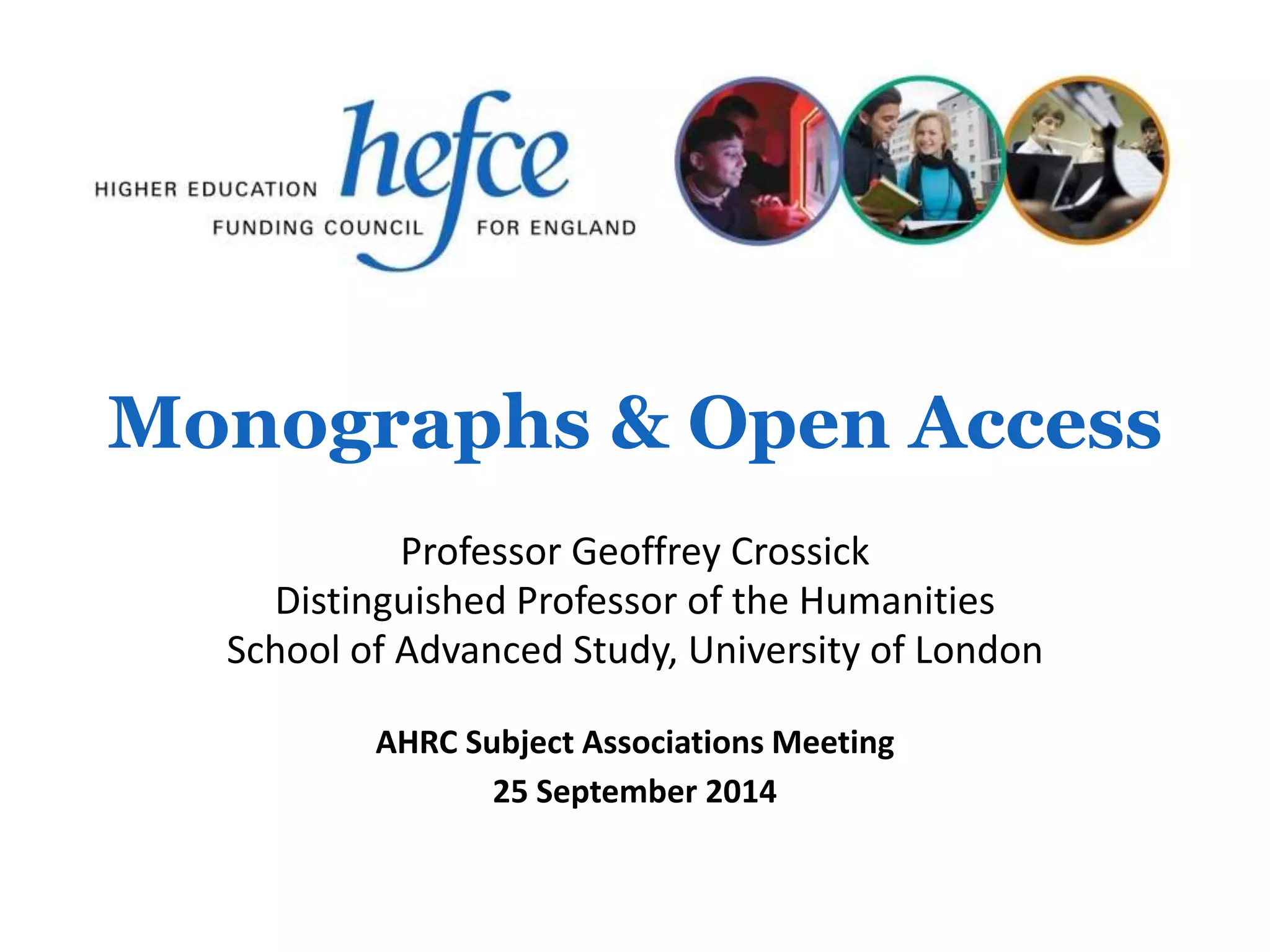 The HEFCE Monographs & Open Access Project was set up to identify and clarify issues around making monographs openly accessible online, taking a long-term perspective beyond REF 2020. The project examines the culture of monographs in the humanities and social sciences, whether there is a crisis for the monograph form, and how publishing innovations and access models may impact monographs. The project has convened an expert group, conducted research including focus groups, and will report findings to HEFCE in late 2014. Key issues being considered include the role and definition of the monograph, peer review and quality standards, licensing models, and ensuring a balance of private and public benefits from any new models.