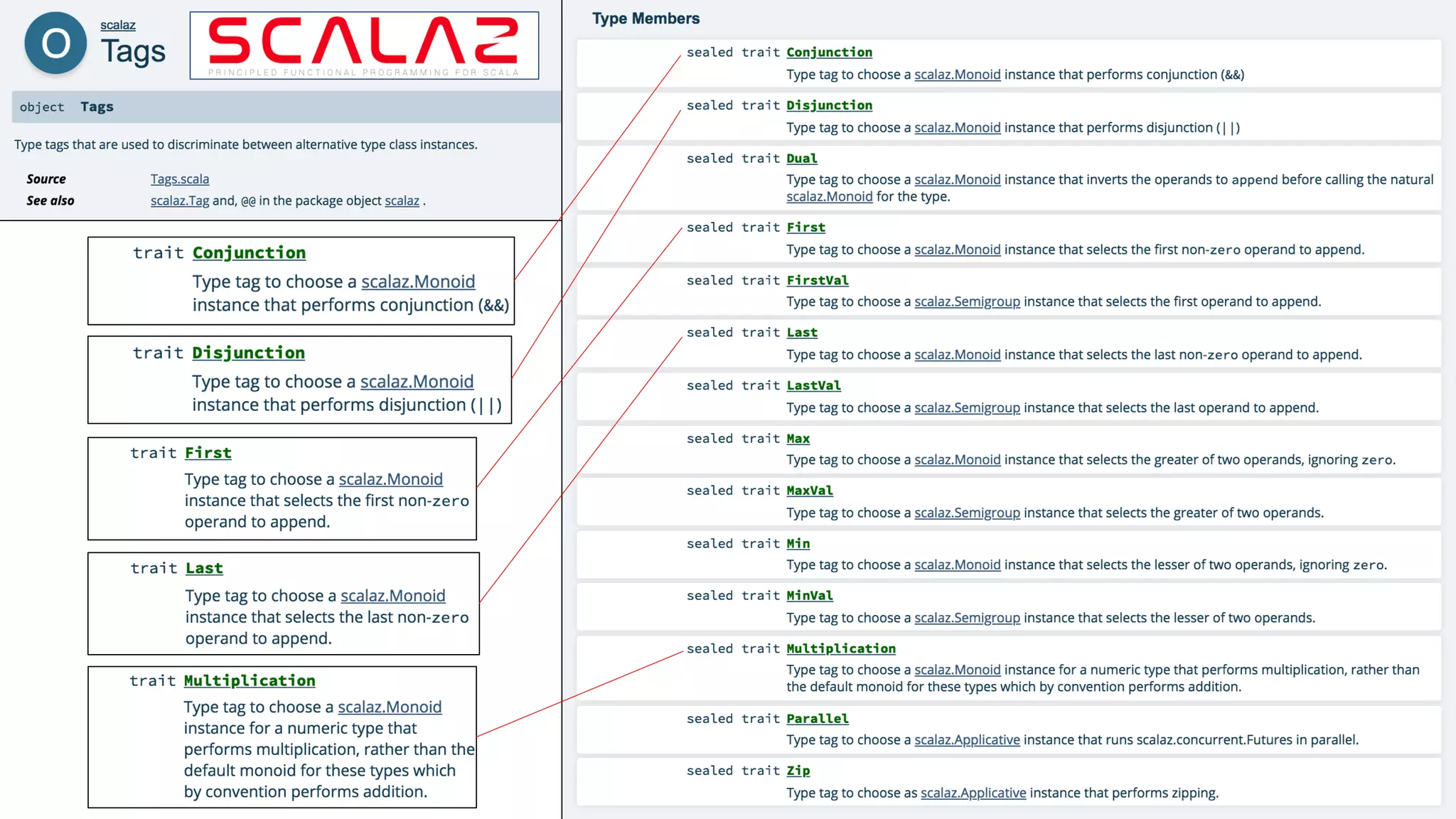 1) A monoid consists of a type A, a binary operation op that combines two values of type A, and a zero value that acts as an identity.