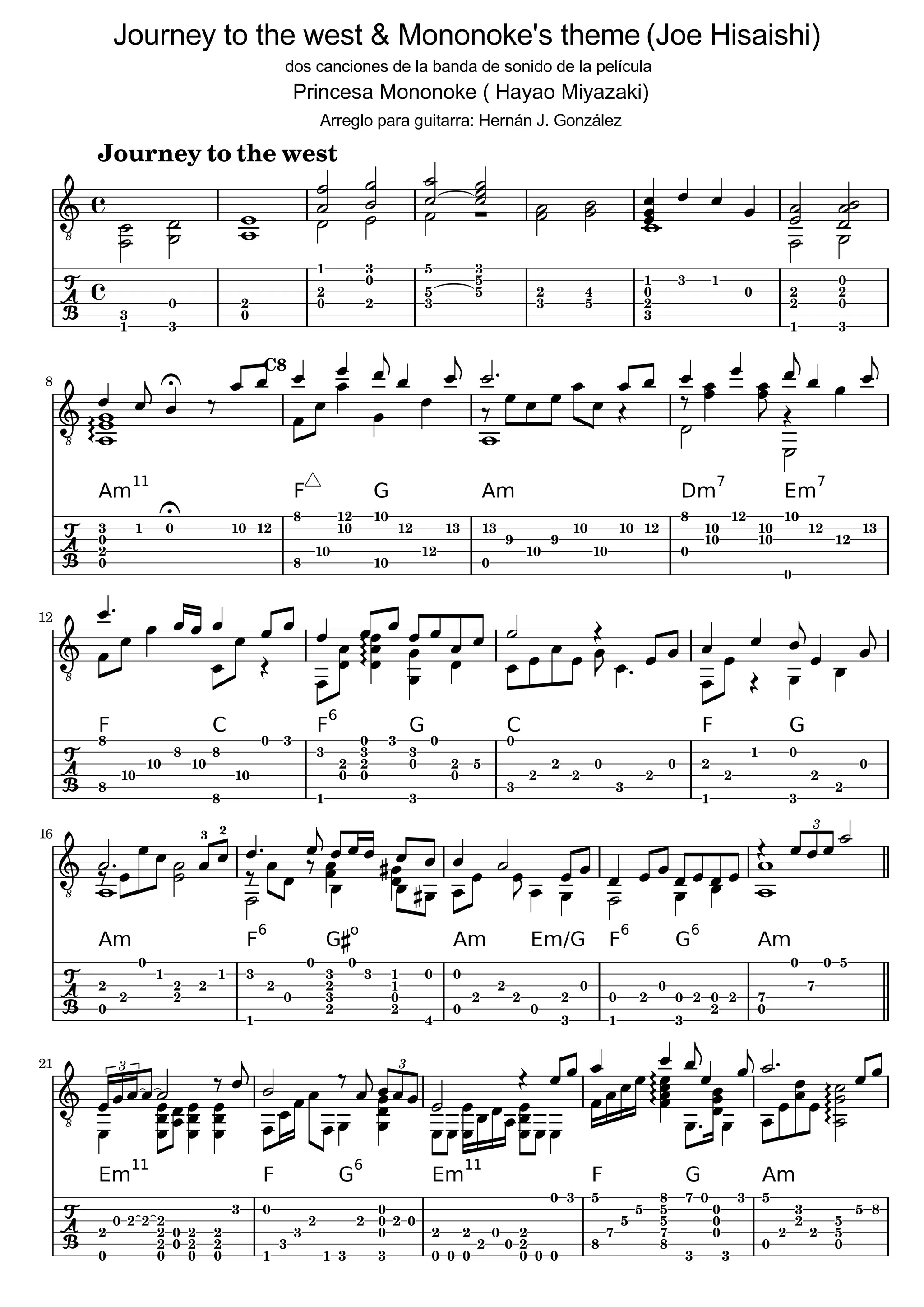 1) The document provides sheet music arrangements for two songs from the Princess Mononoke soundtrack: "Journey to the West" and "Mononoke's Theme" by composer Joe Hisaishi.