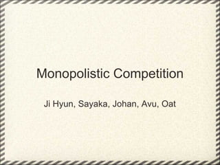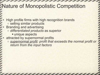 This document discusses monopolistic competition, including its key characteristics, assumptions, and how firms determine costs, revenues, and profits in the short and long run. Some key aspects of monopolistic competition are that firms have differentiated products, there are many firms but some are small, and there are relatively low barriers to entry. Firms set price at the point where marginal cost equals marginal revenue to maximize profits in the short run. In the long run, firms earn normal profits and the industry reaches equilibrium. Examples given include soft drink companies, sports shoe companies, and other branded consumer goods industries.