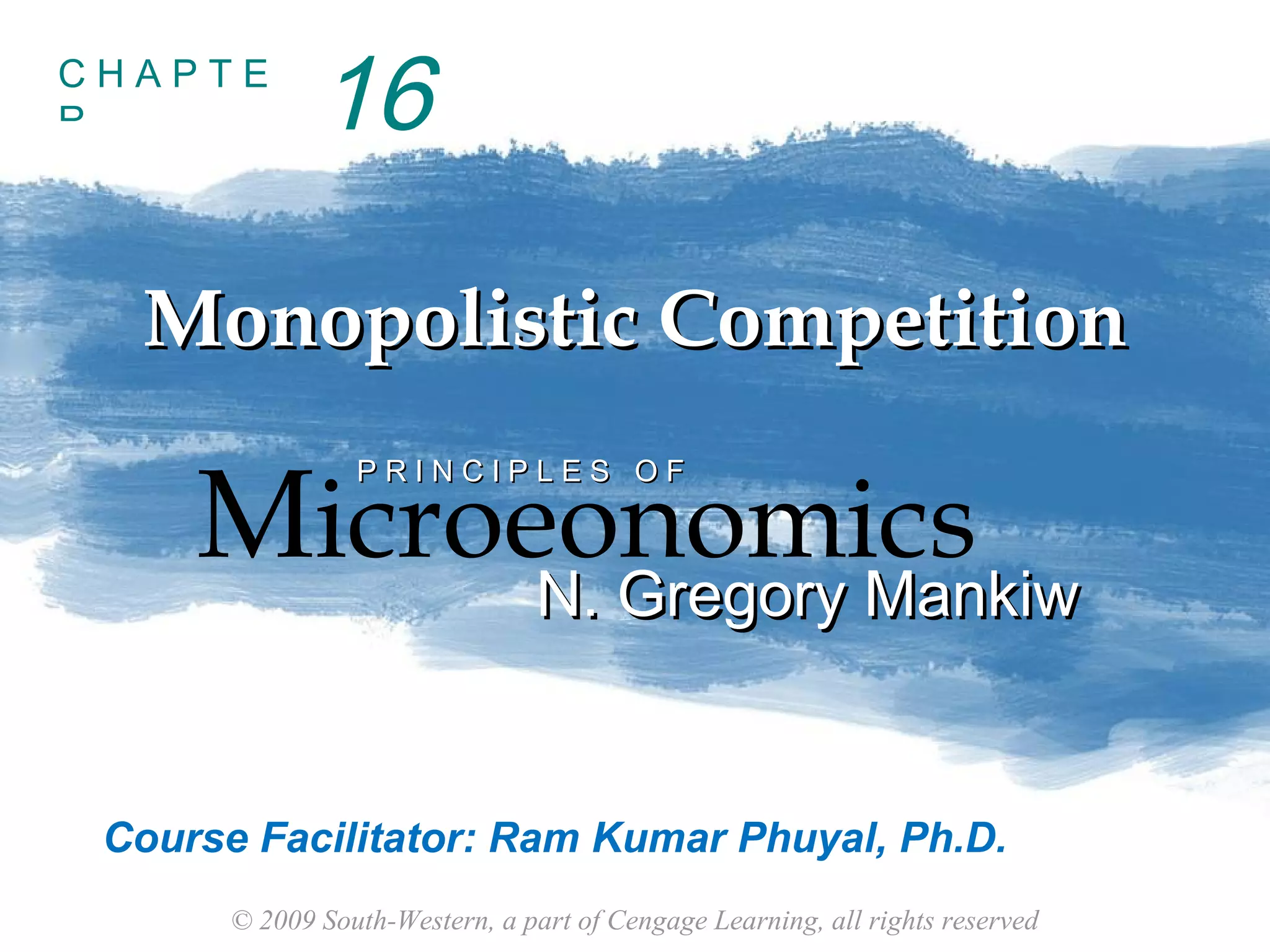 This document discusses monopolistic competition as a market structure between perfect competition and monopoly. Key points include: