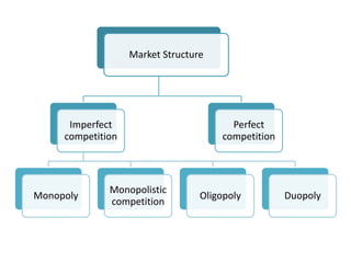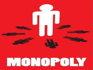The document discusses the concept of monopoly in market structures, defining it as a situation where a single seller controls the market without competition or close substitutes. It outlines various types and causes of monopolies, including natural, legal, and technological monopolies, as well as the disadvantages such as poor service and consumer exploitation. The document also offers lessons for business managers on managing risks and the importance of negotiation and diversification.