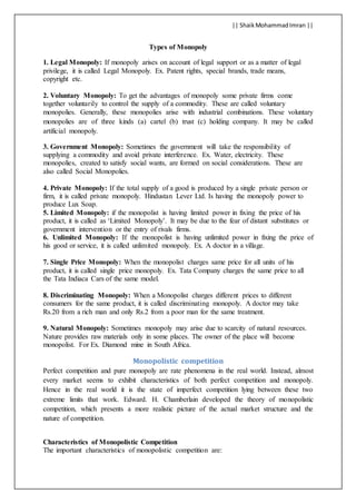 1. Legal monopoly which arises from legal protections like patents or trademarks