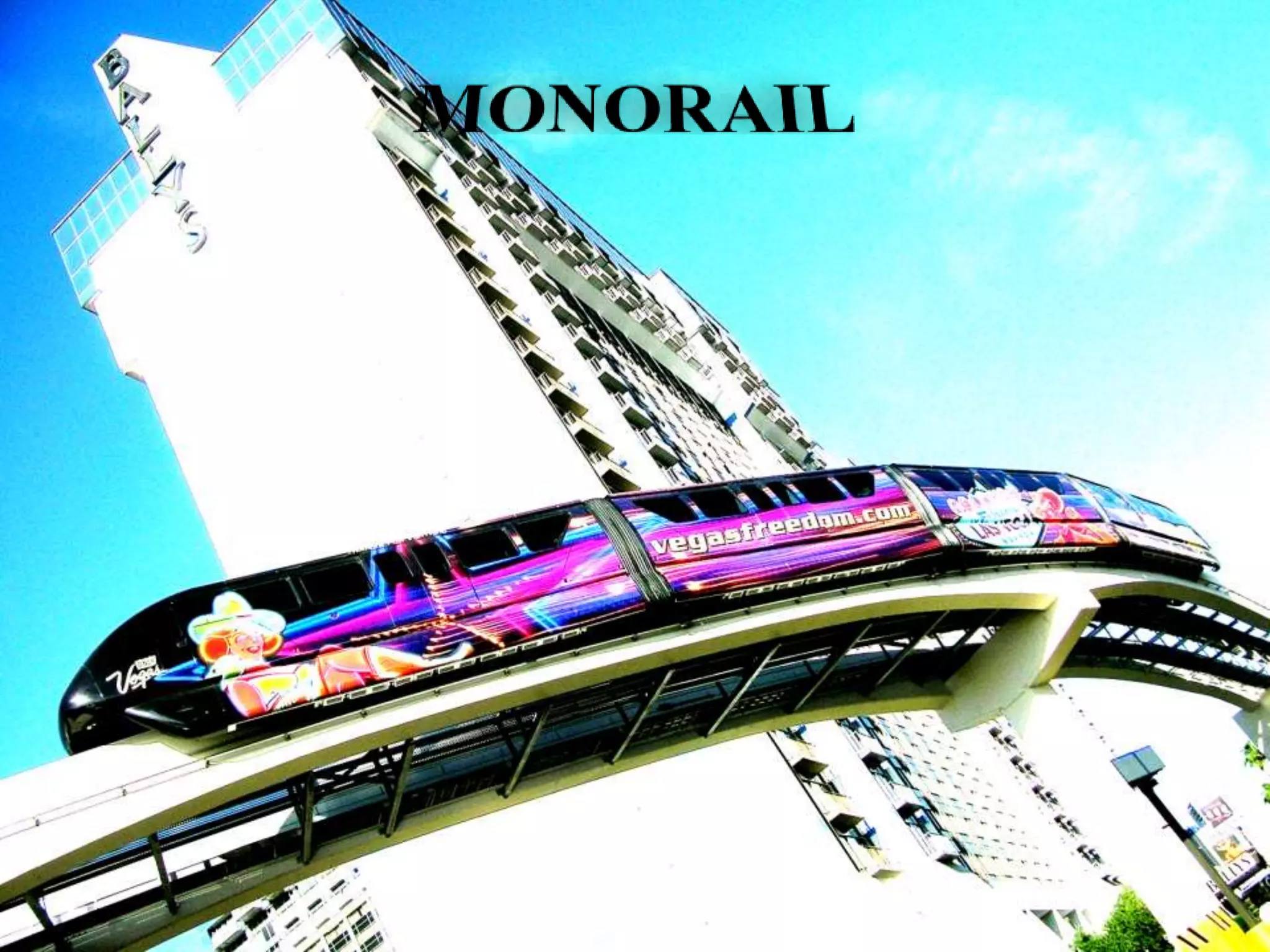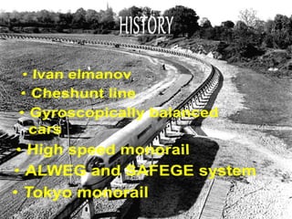 The document discusses different types of monorails including straddled beam, suspended monorail, and magnetic levitation monorails. It describes the planned Calicut monorail in Kozhikode, India, which would use a straddled beam type due to heavy traffic and narrow roads. The Calicut monorail would run from Kozhikode to Medical College and have 15 stations. It also discusses monorail infrastructure requirements and operations, as well as the mechanical components and examples of monorails in other cities. In conclusion, monorails can help develop transportation and industries while minimizing environmental impacts compared to other transit systems, though the initial costs are higher.
