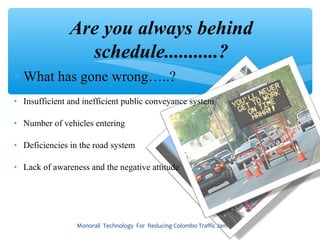 The document proposes implementing a monorail system in Colombo, Sri Lanka to help reduce traffic jams. It identifies the main causes of traffic as an insufficient public transportation system, high vehicle volume, road deficiencies, and a lack of public awareness. The document then discusses monorail technology, how it works using power, magnetic levitation and switching, and its potential benefits including efficiency, profitability, simplicity, aesthetics, and safety.