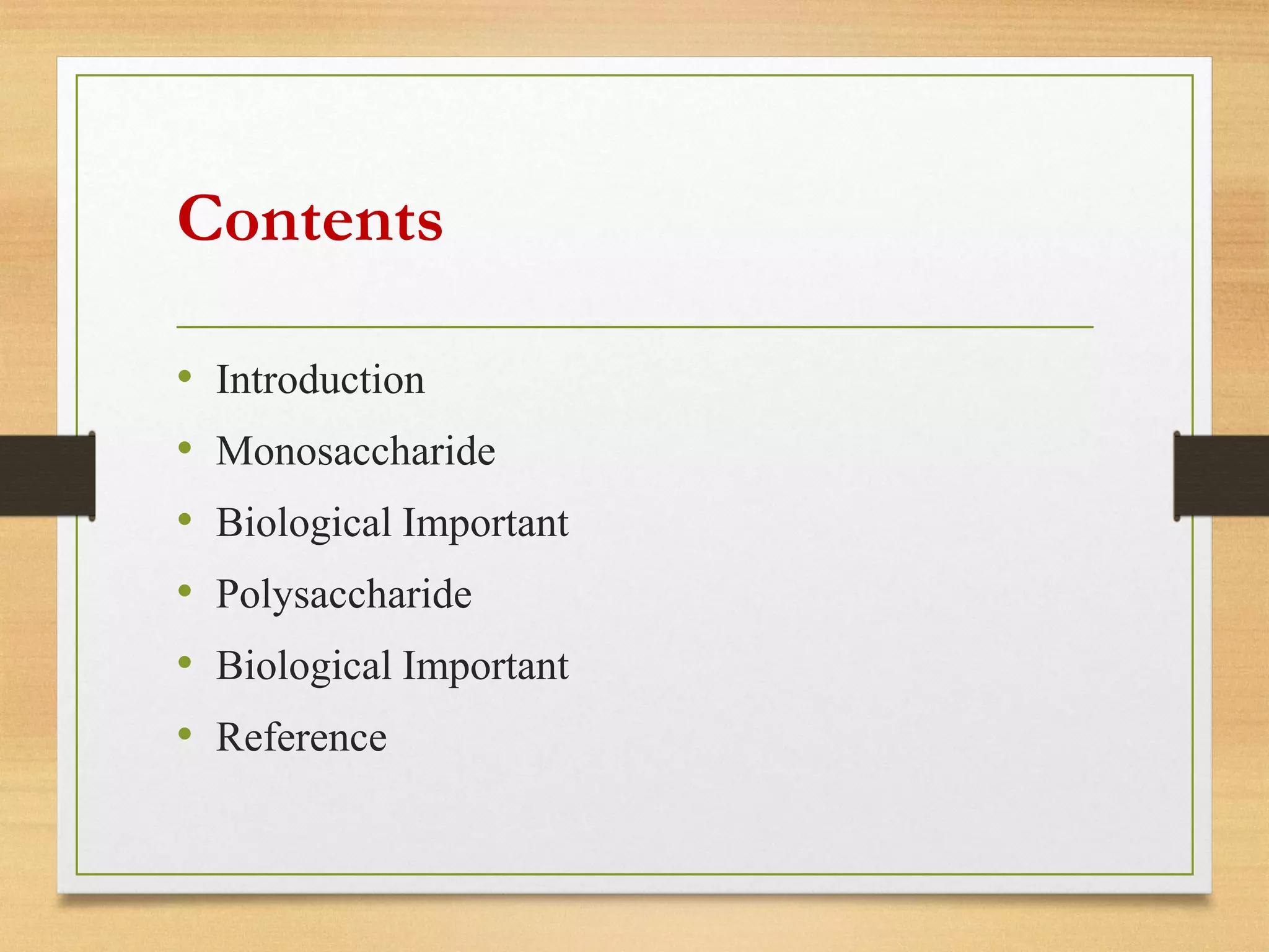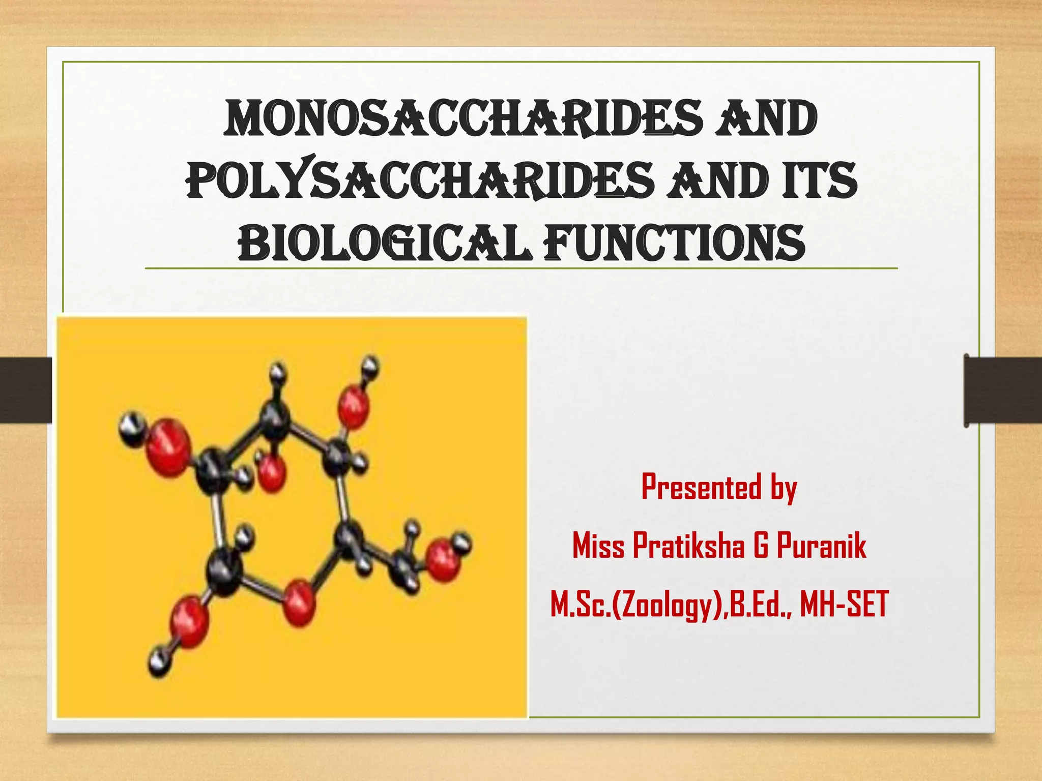 The document discusses monosaccharides and polysaccharides, emphasizing their structures and biological functions. Monosaccharides, such as glucose and fructose, are simple sugars essential for energy production, while polysaccharides, including starch and glycogen, serve as storage forms of carbohydrates in plants and animals. Additionally, it highlights the roles of these carbohydrates in nature and mentions other polysaccharides like cellulose and chitin.