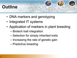 This document summarizes advances in plant breeding through the use of DNA markers and genotyping. It discusses how DNA markers have been identified and mapped, allowing traits to be rapidly incorporated into elite plant varieties through marker-assisted selection. Integrated IT systems now allow breeding programs to process millions of data points from thousands of lines. Marker-assisted breeding is accelerating the integration of biotech traits and enabling large-scale screening for simply inherited traits. This approach has increased genetic gain and the rate of breeding progress compared to conventional methods.