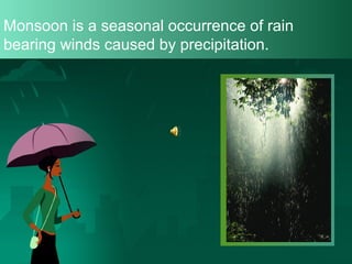 The monsoon season in India arrives around the first week of June and lasts until the middle of September, bringing heavy rainfall from winds from the Indian Ocean and Arabian Sea. Cherrapunji, located in the state of Meghalaya, receives the highest average annual rainfall in the world of over 11,000 mm, with the majority falling between June and August during monsoon season. Indian agriculture and the wider economy depend greatly on the timely arrival of monsoons for water and power.